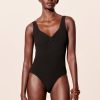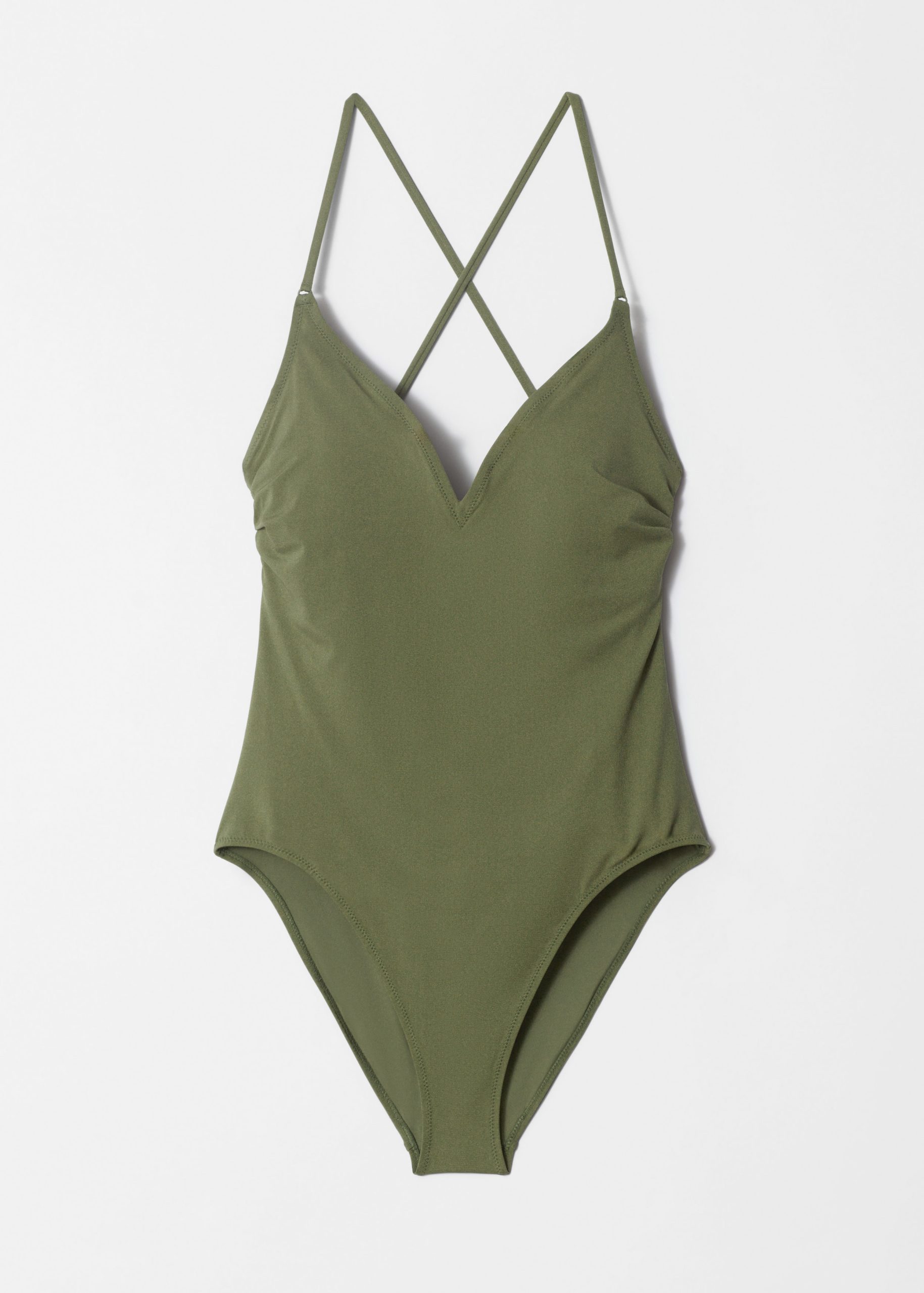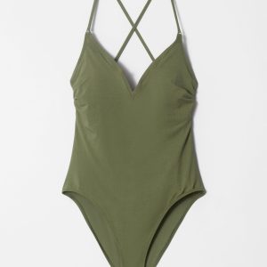 V-neck swimsuit featuring adjustable straps, and a scooped racer back with a self-tie closure.