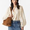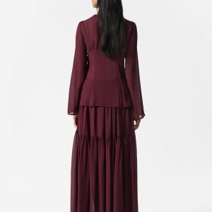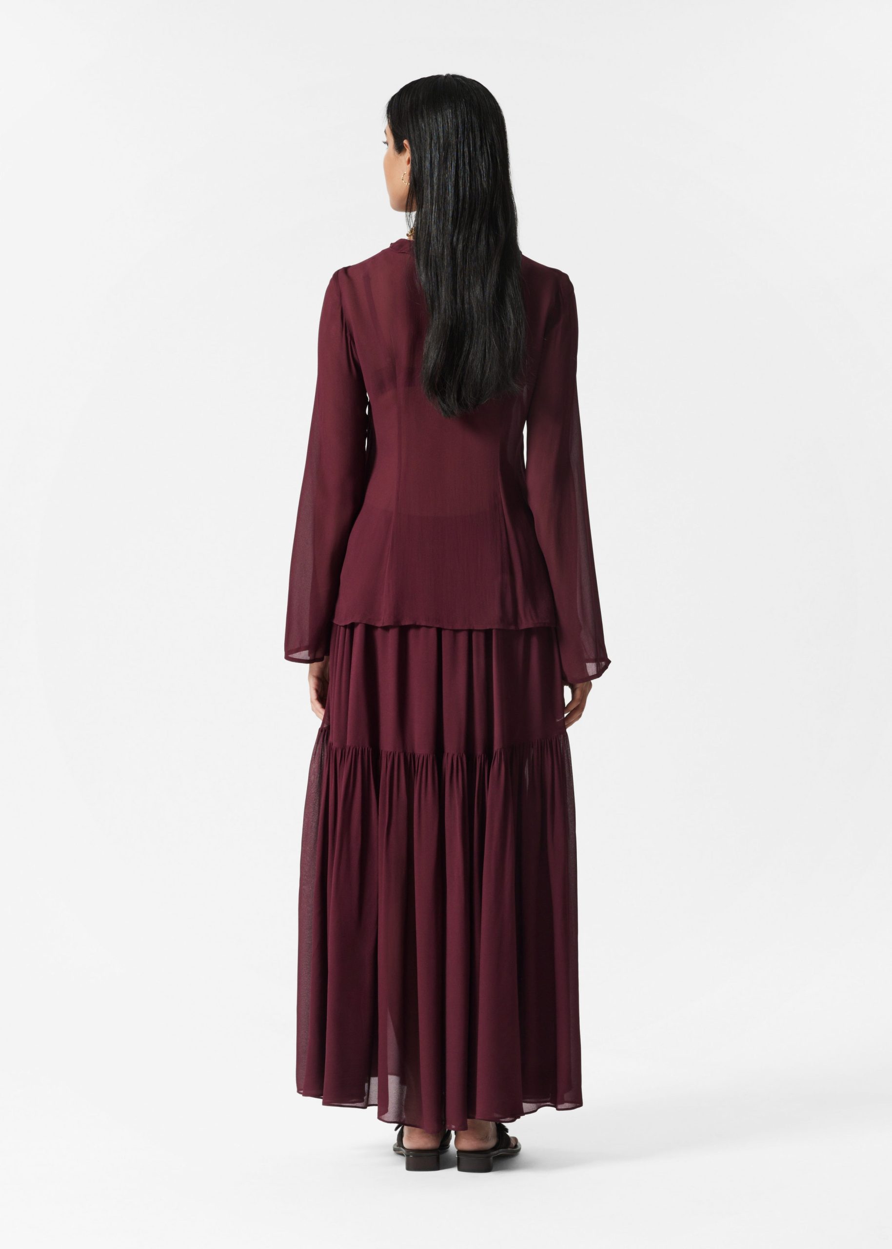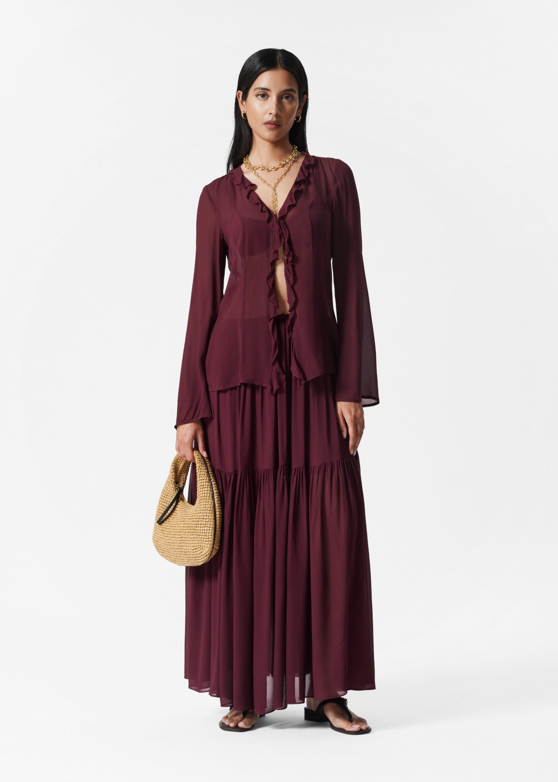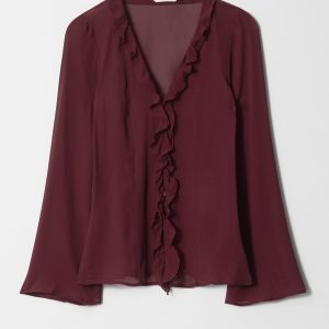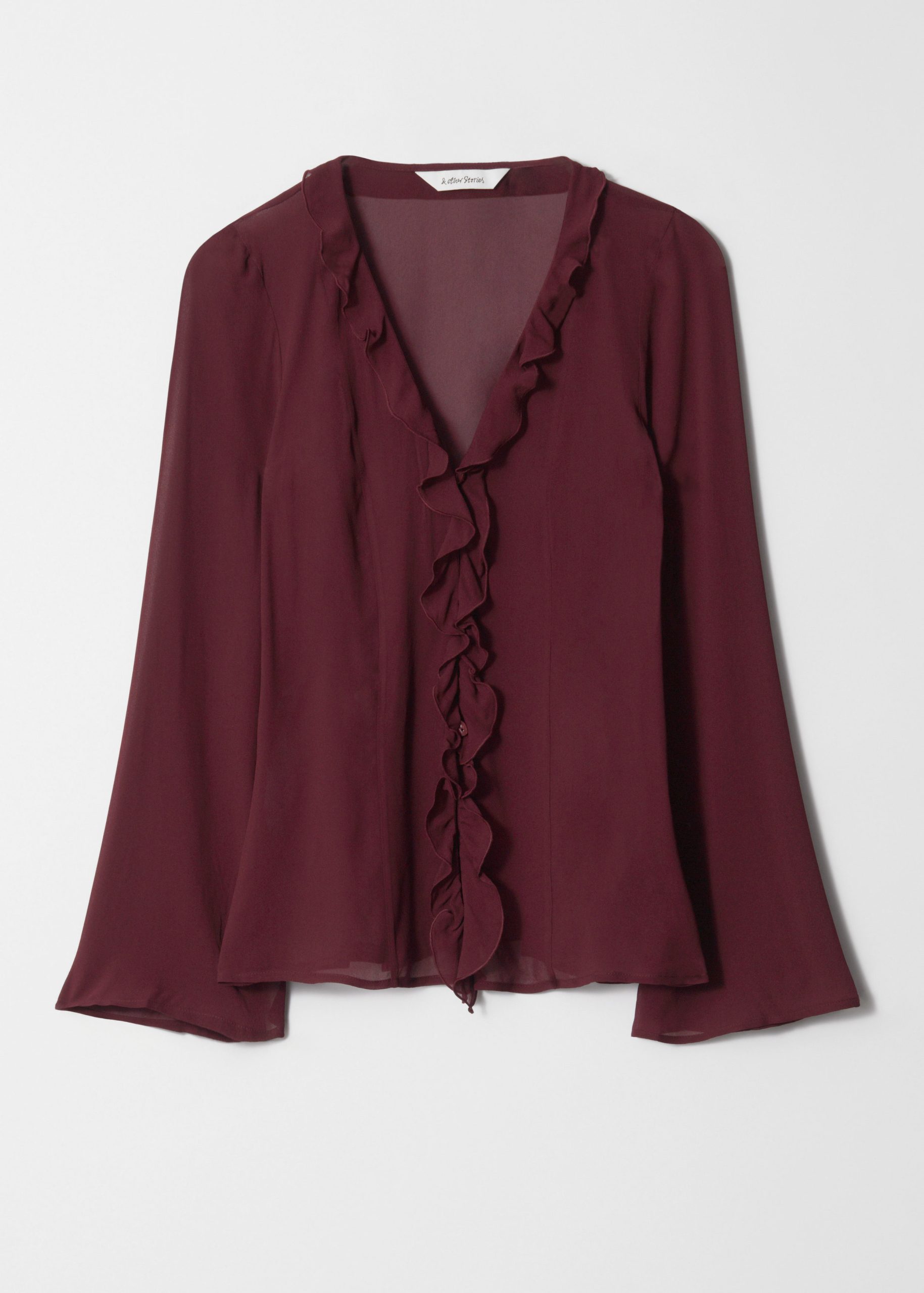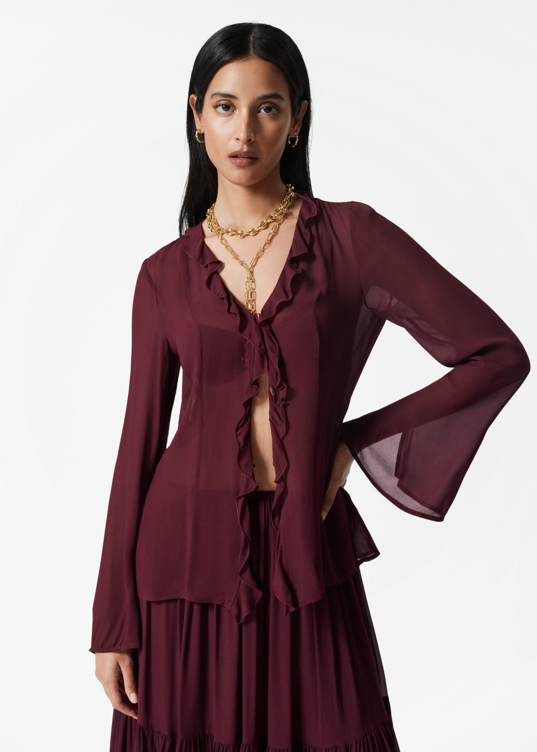 This blouse offers a modern take on 70’s boho. Crafted from a sheer and lightweight chiffon fabric that gently drapes the body. Cut in a fitted silhouette, it features a v-neckline framed by delicate ruffles and long sleeves with flared cuffs, finished with subtle slits. Traced with three button closures at the front.
