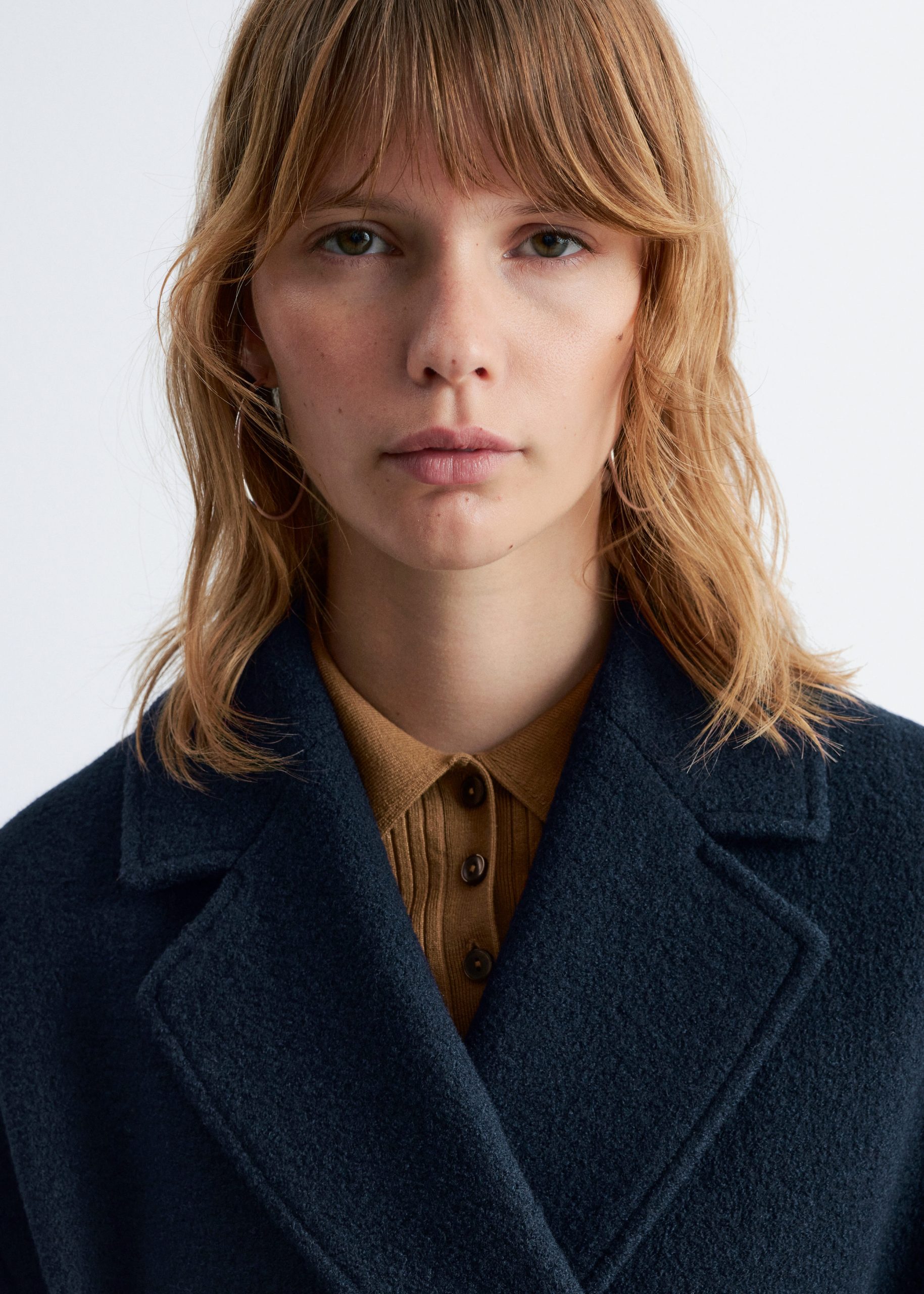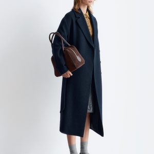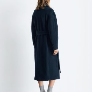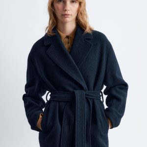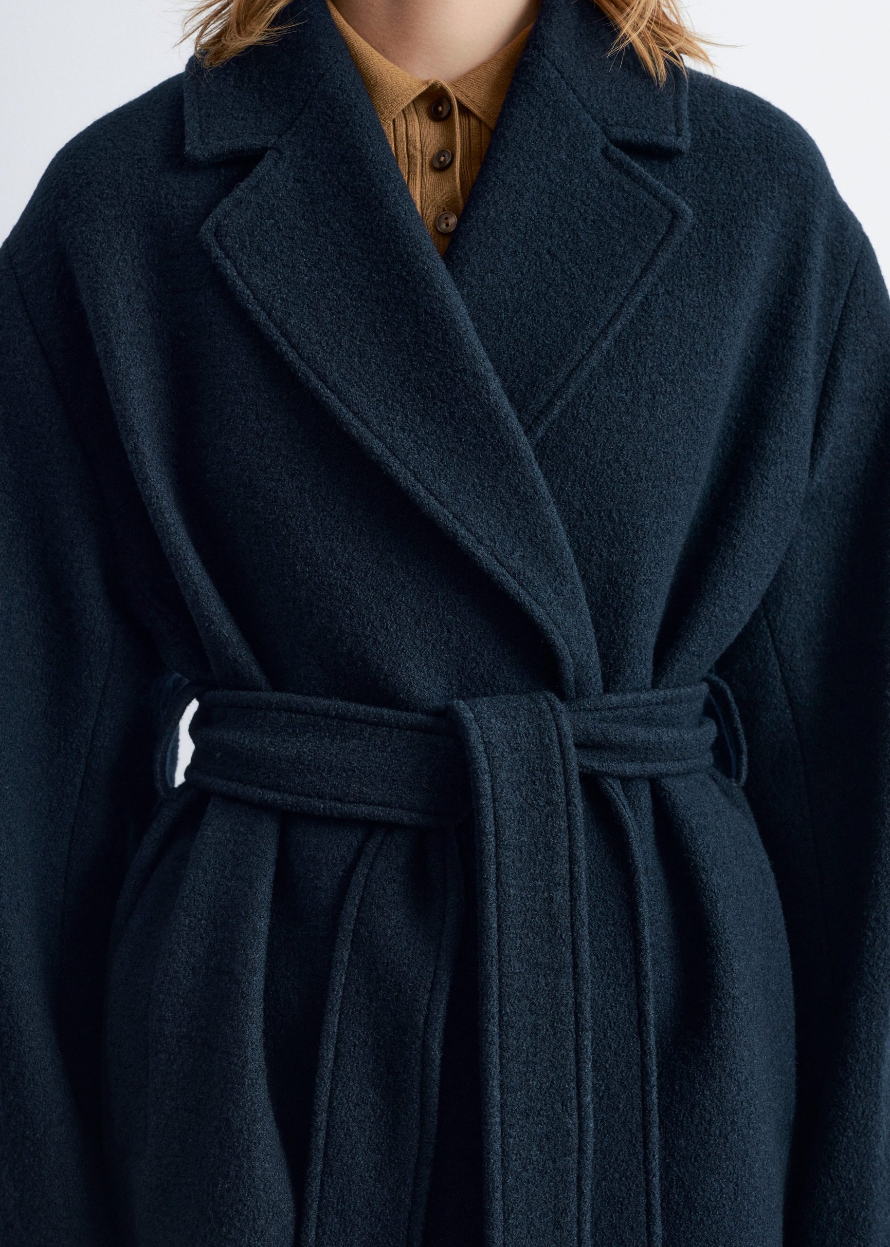 Voluminous wool coat featuring an overlapping lapel. Finished with a tonal self-tie belt.