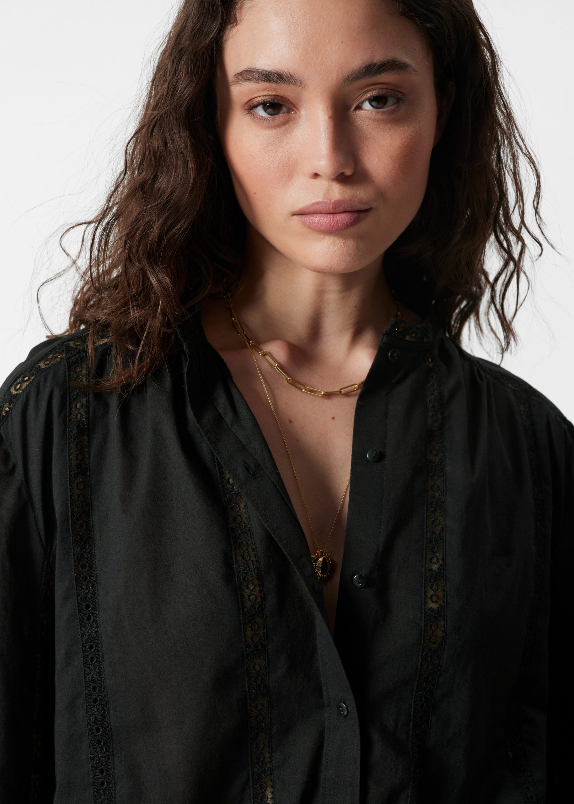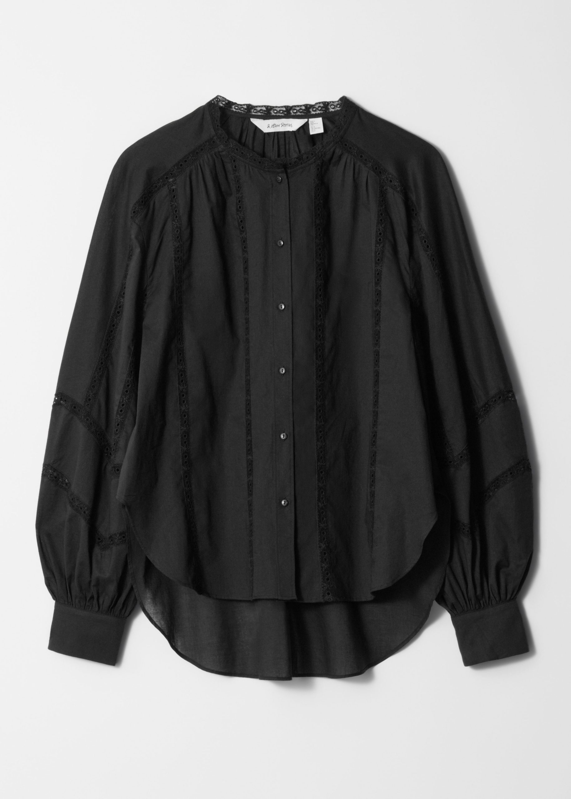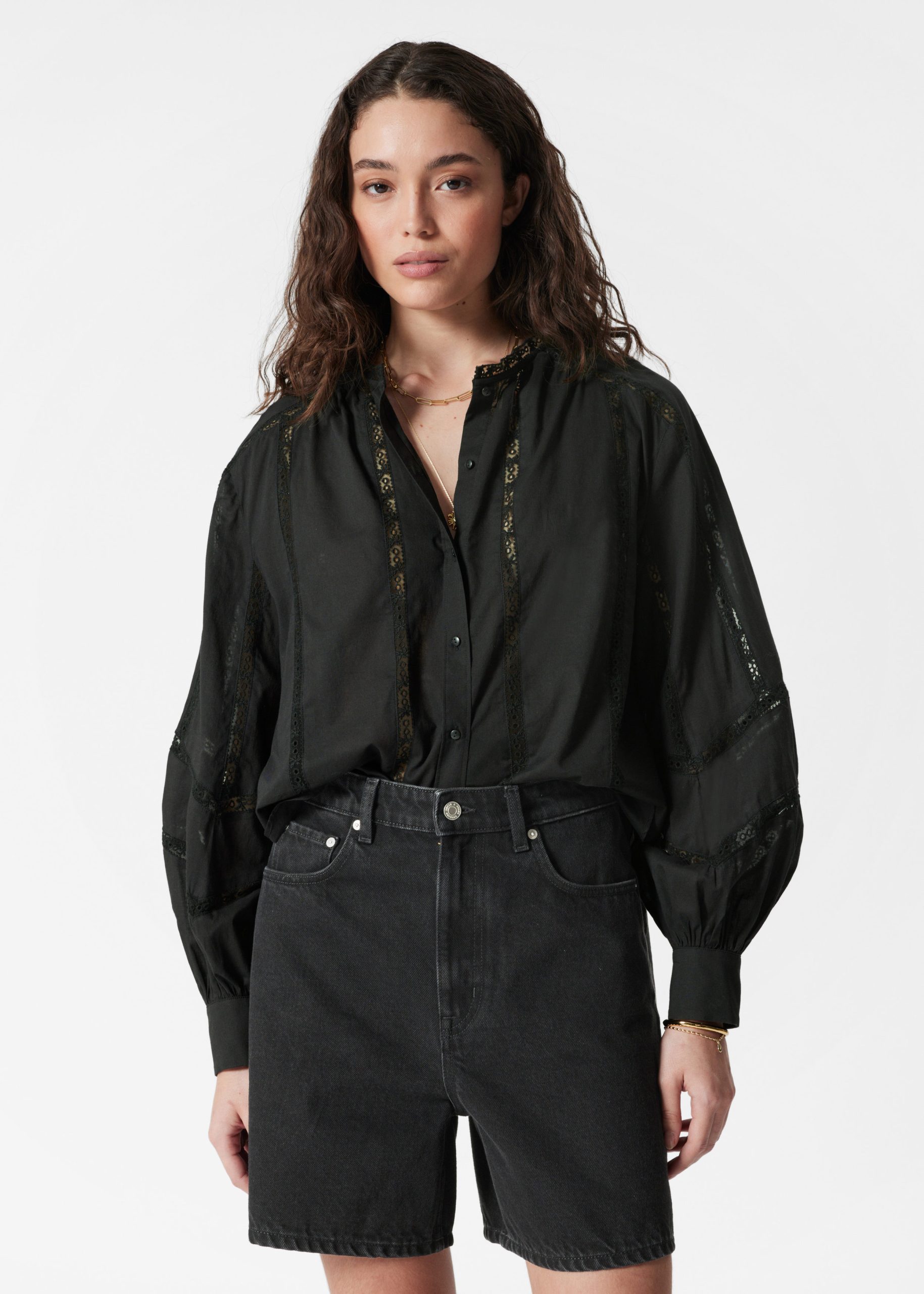 This blouse is crafted from a light and airy cotton fabric. Cut in a loose silhouette, it features a band collar, voluminous balloon-sleeves with buttoned cuffs, and delicate lace-tape detailing throughout. Traced with buttons down the front. Tuck it into denim shorts on warm-weather days, or wear it loose for an undone, breezy look.