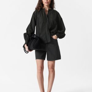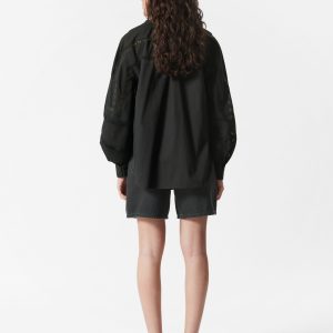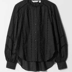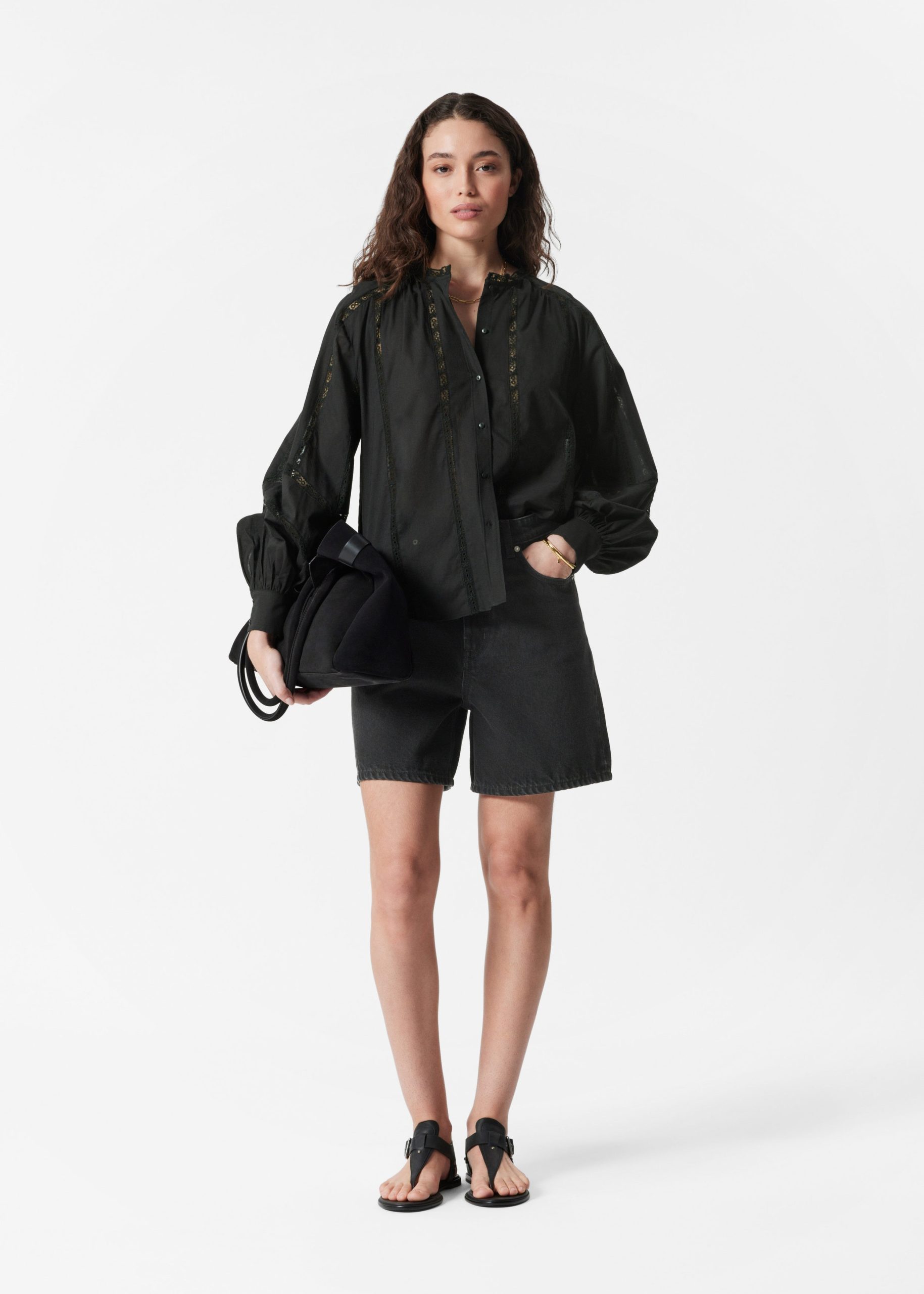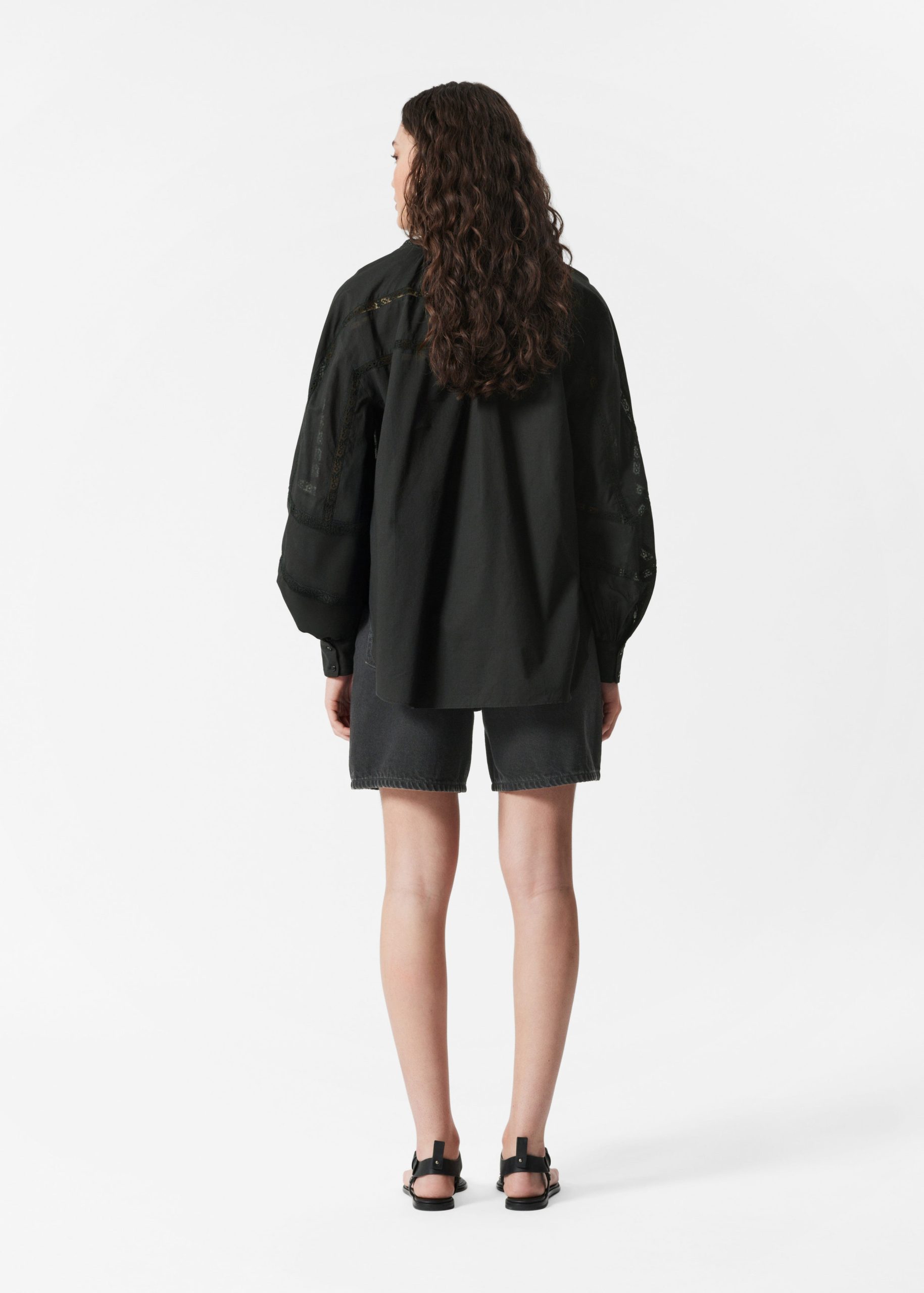 This blouse is crafted from a light and airy cotton fabric. Cut in a loose silhouette, it features a band collar, voluminous balloon-sleeves with buttoned cuffs, and delicate lace-tape detailing throughout. Traced with buttons down the front. Tuck it into denim shorts on warm-weather days, or wear it loose for an undone, breezy look.