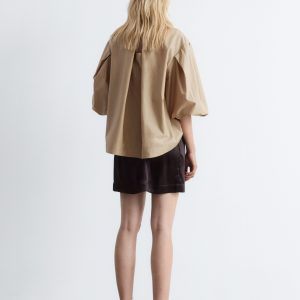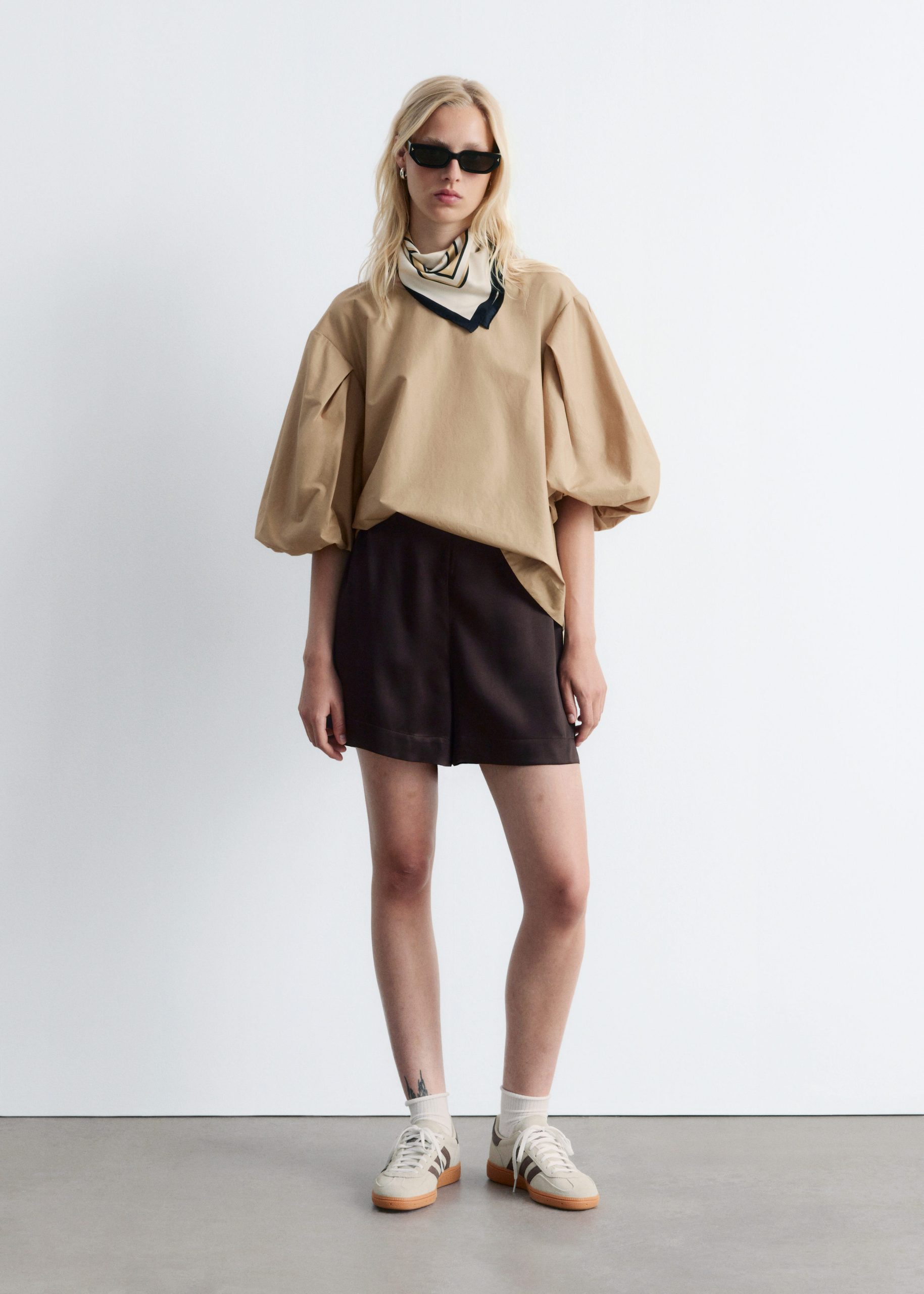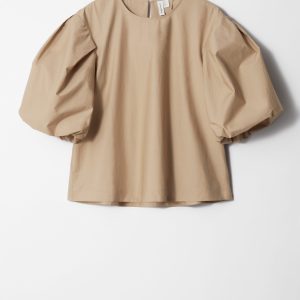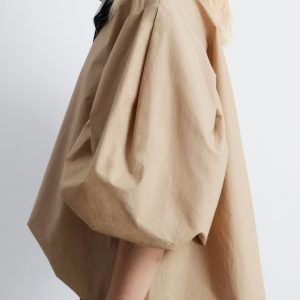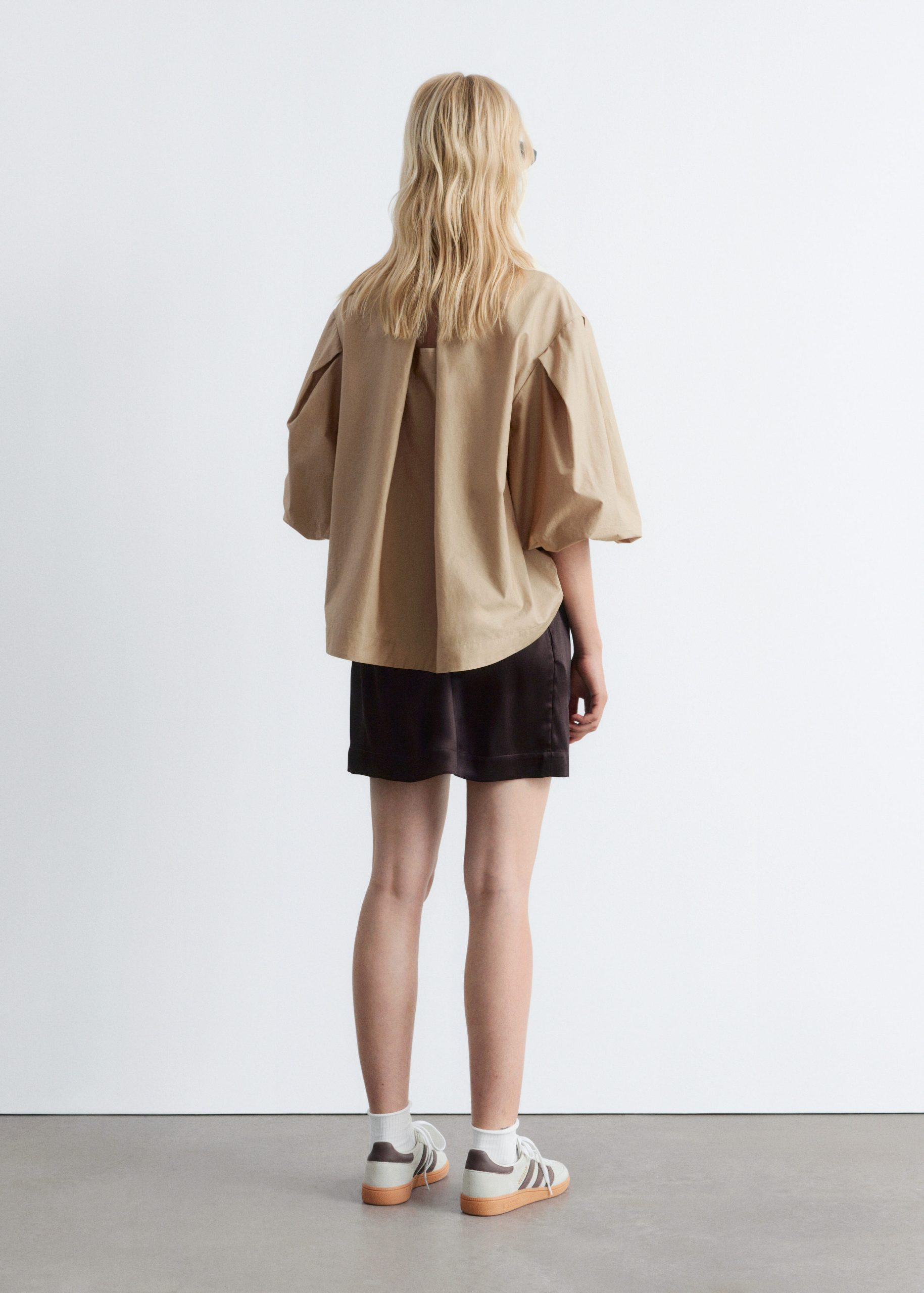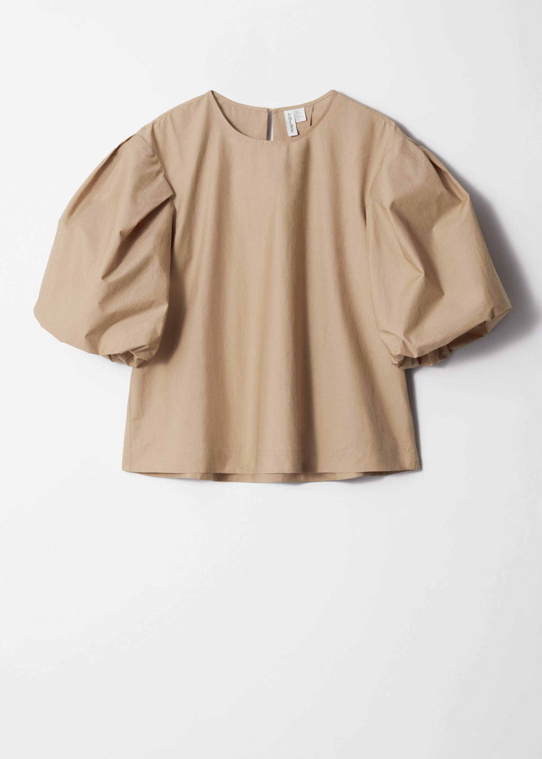 Crafted from 100% pure cotton, this blouse offers a crisp, breathable feel ideal for warm weather. Designed with a boxy silhouette, it features a clean, round neckline and voluminous puff sleeves that lend a sculptural edge. Finished with a wide box pleat that runs vertically down the back, revealing a small keyhole opening concealed with a button at the neck.Â