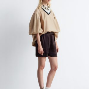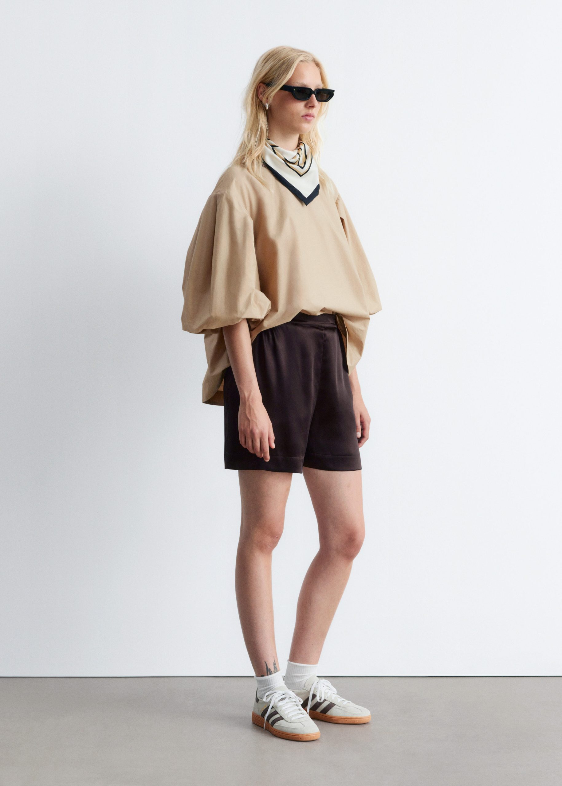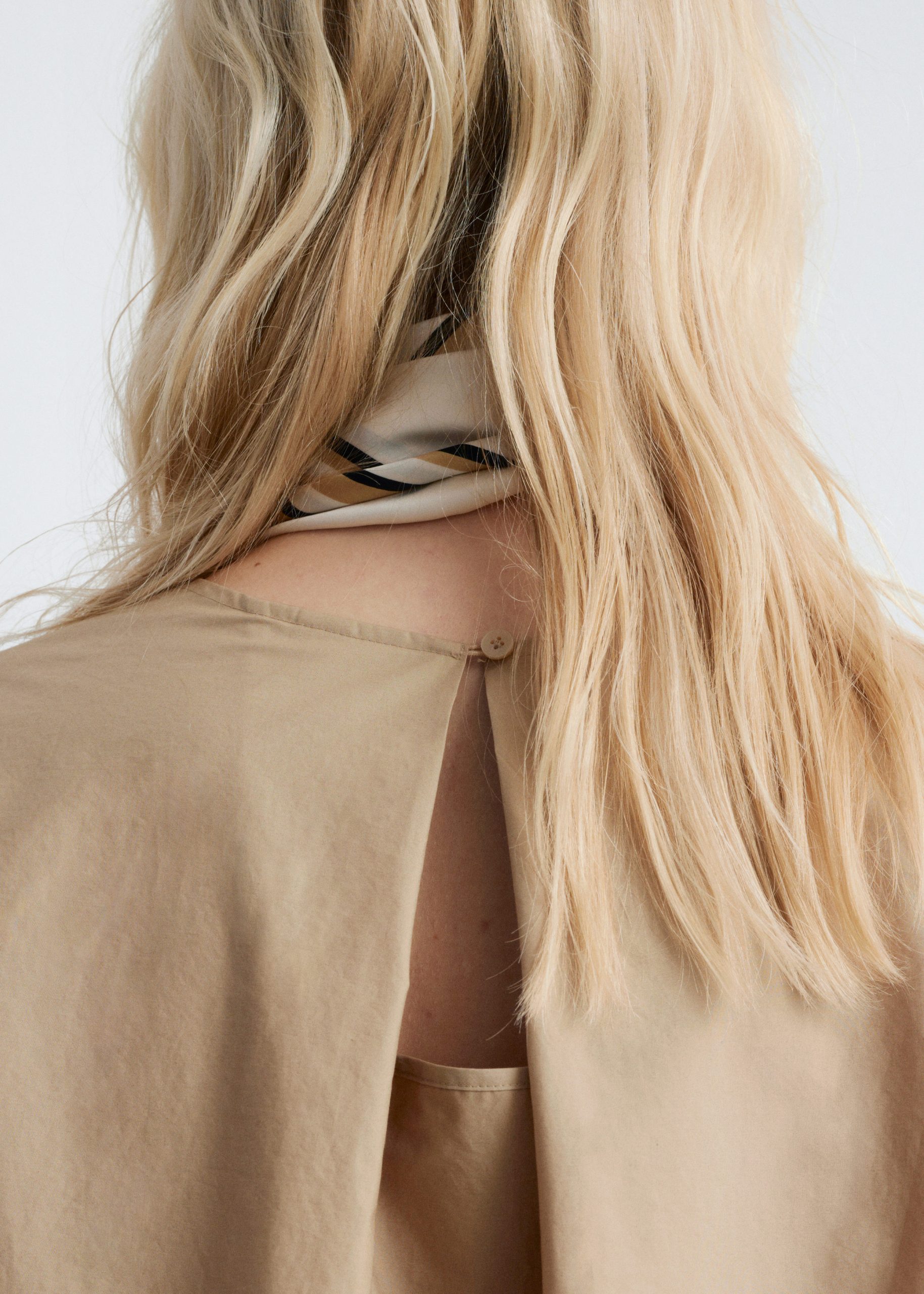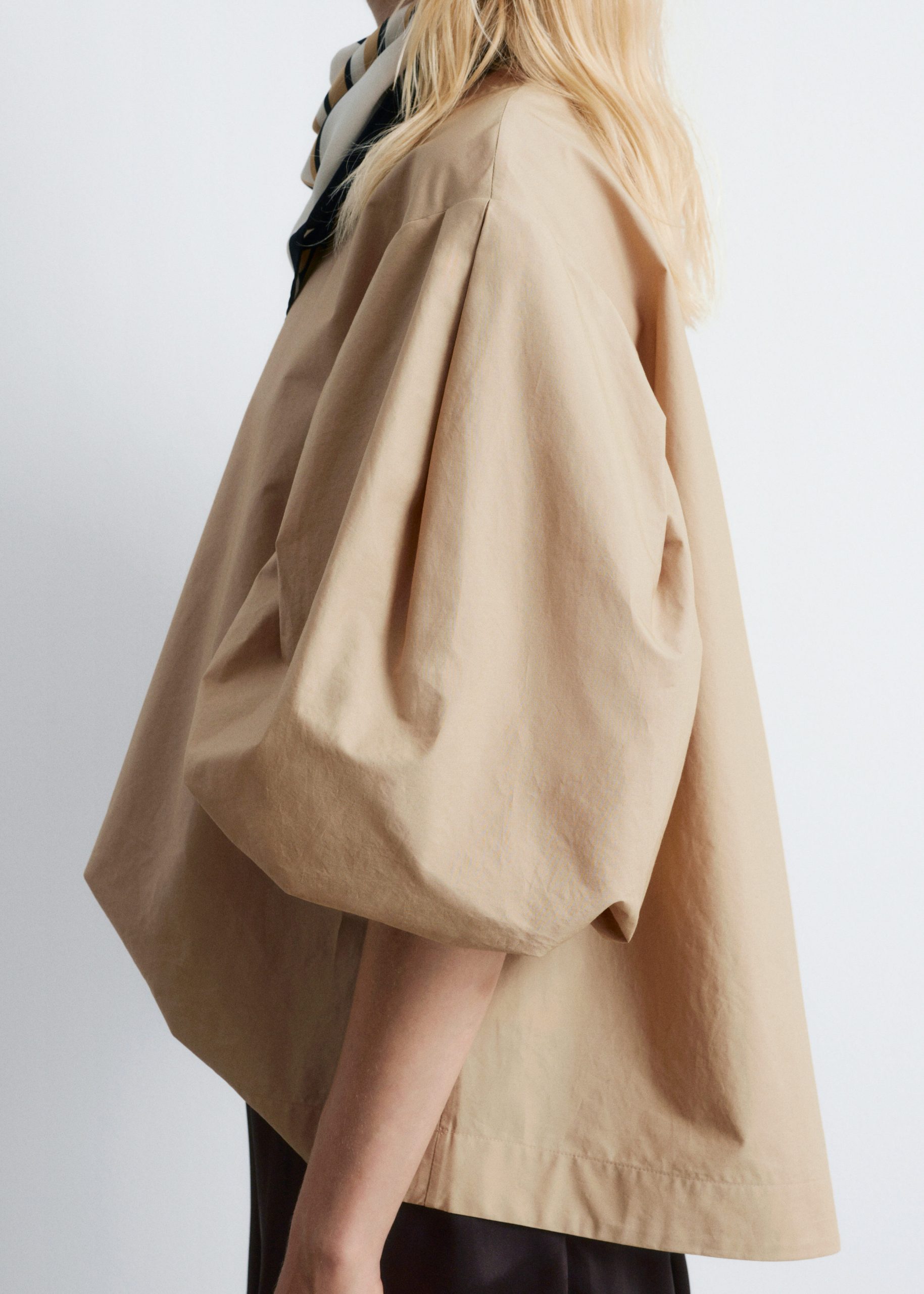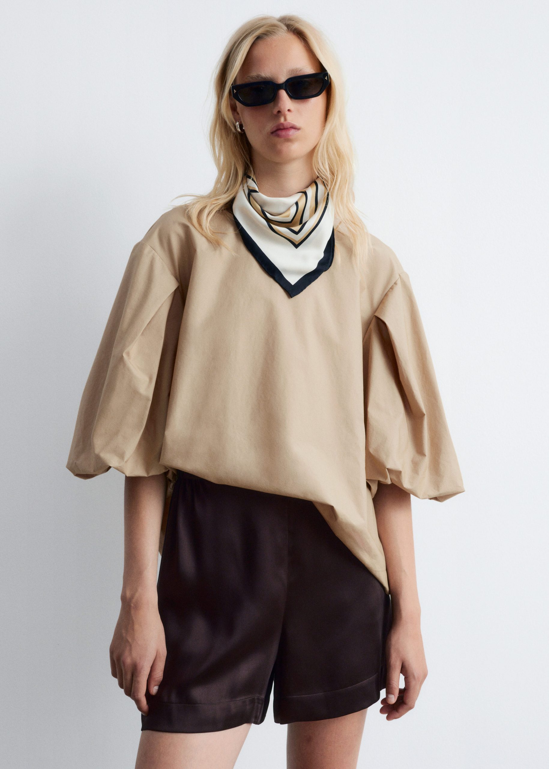 Crafted from 100% pure cotton, this blouse offers a crisp, breathable feel ideal for warm weather. Designed with a boxy silhouette, it features a clean, round neckline and voluminous puff sleeves that lend a sculptural edge. Finished with a wide box pleat that runs vertically down the back, revealing a small keyhole opening concealed with a button at the neck.Â