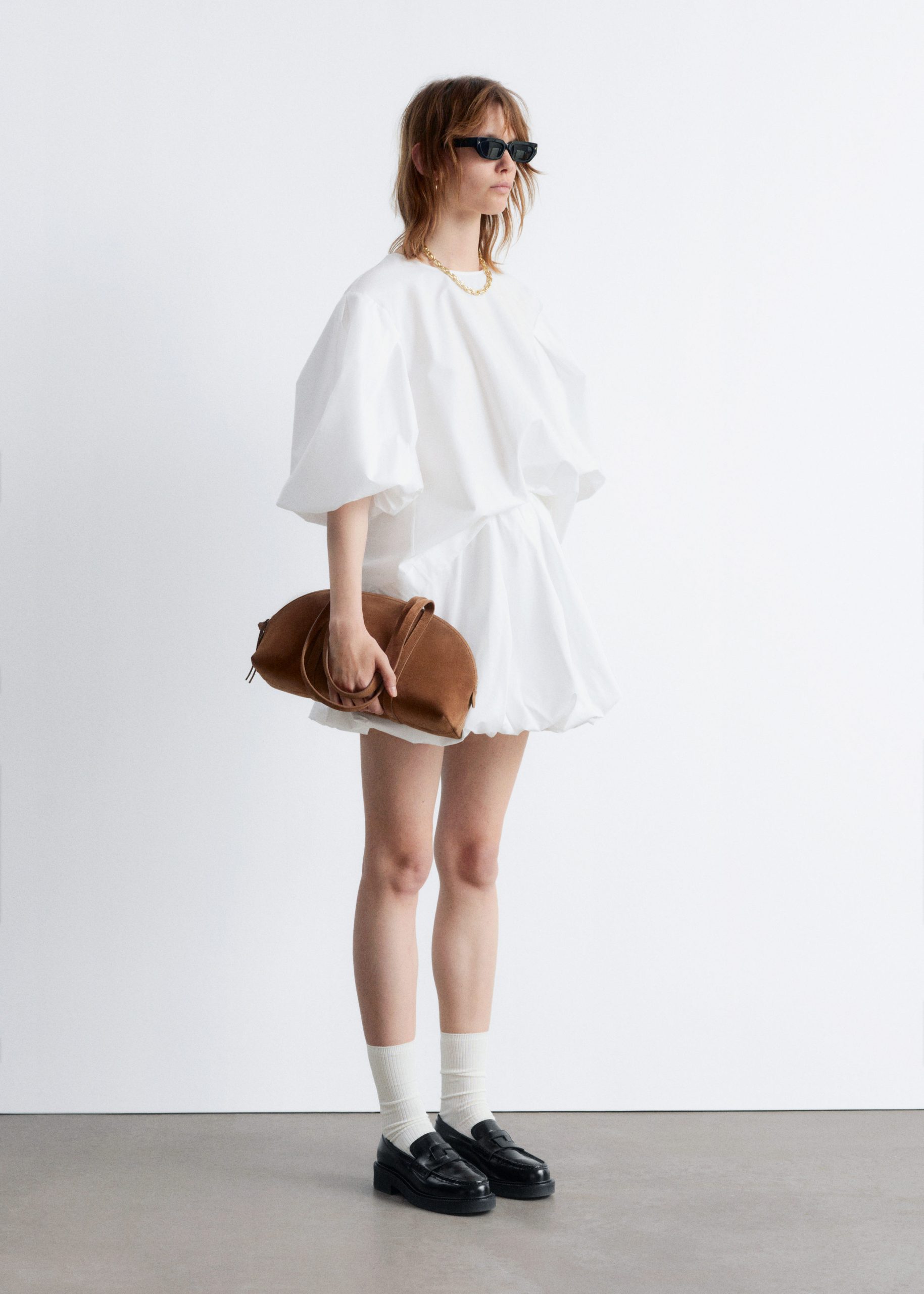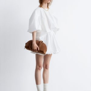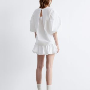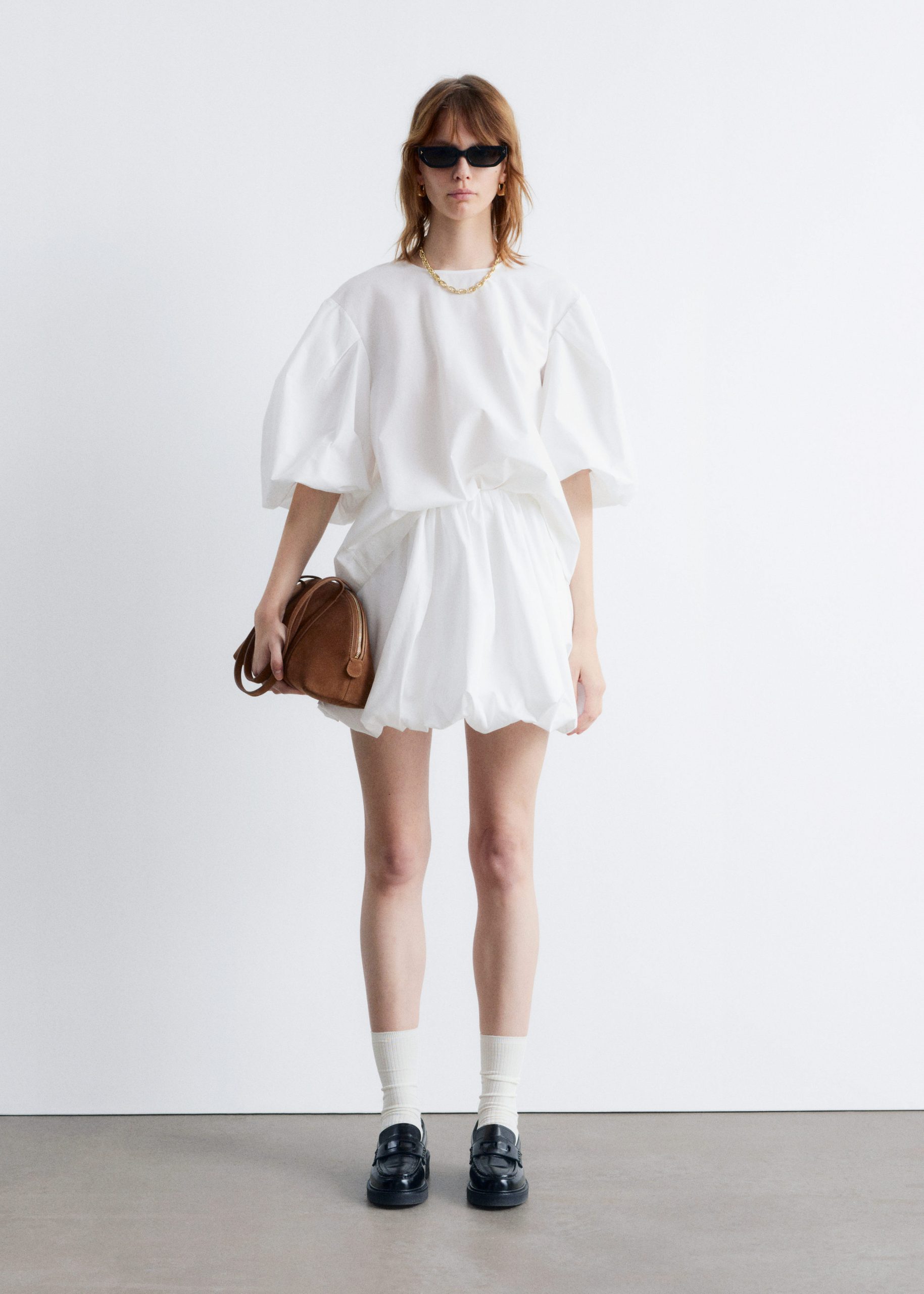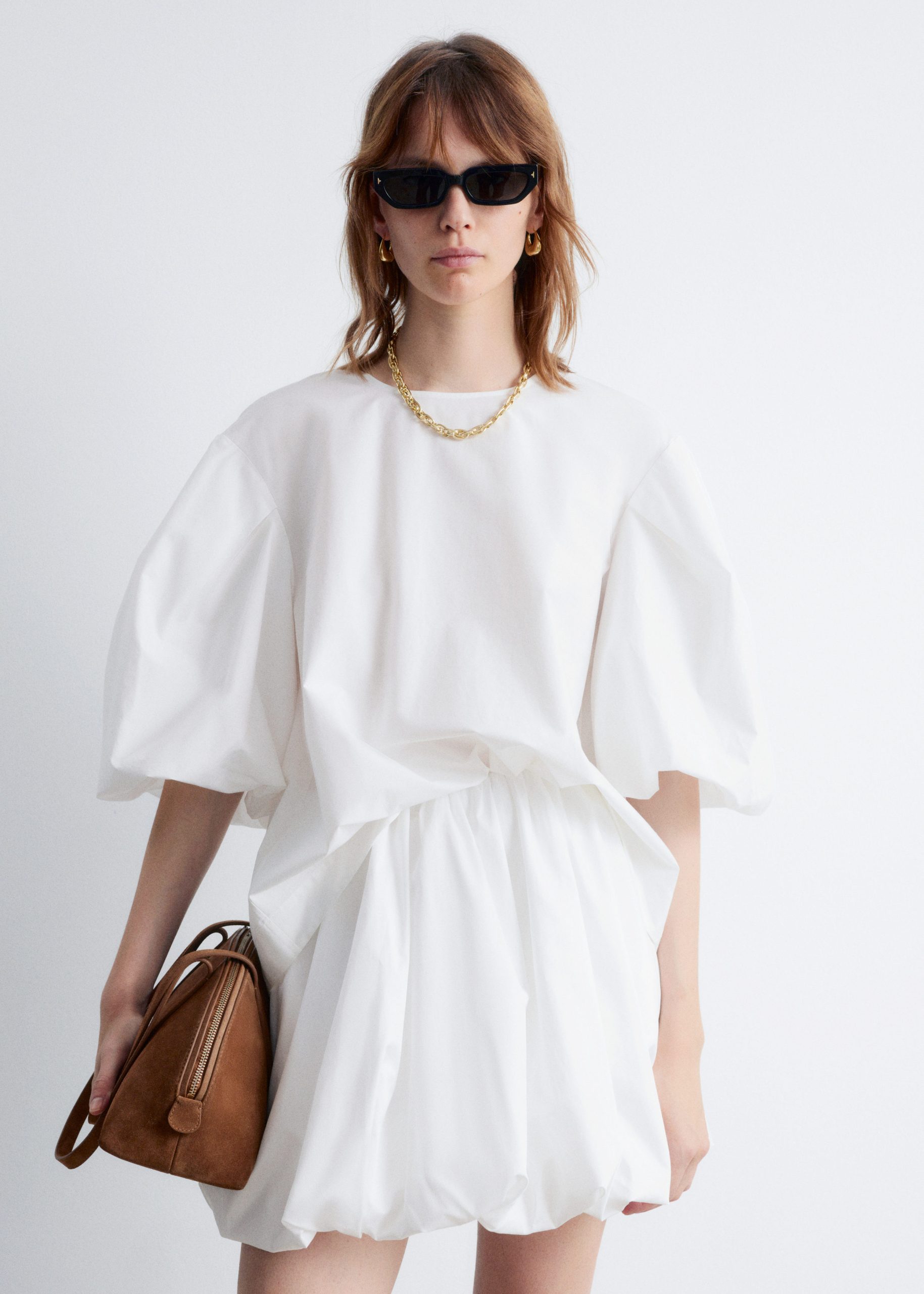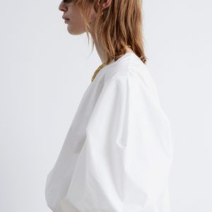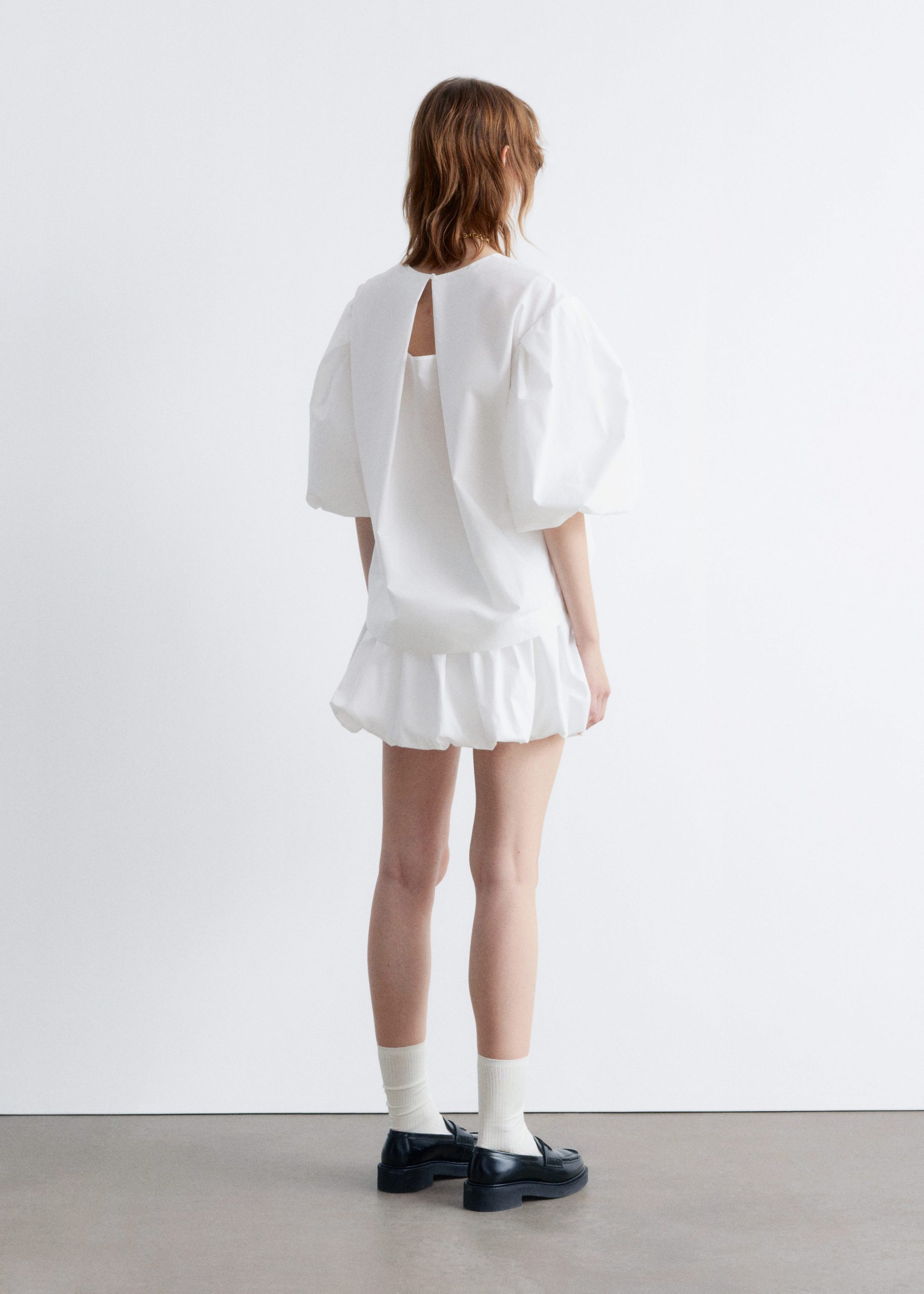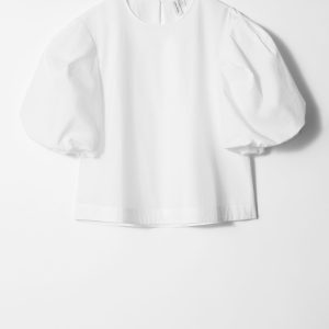 Crafted from 100% pure cotton, this blouse offers a crisp, breathable feel ideal for warm weather. Designed with a boxy silhouette, it features a clean, round neckline and voluminous puff sleeves that lend a sculptural edge. Finished with a wide box pleat that runs vertically down the back, revealing a small keyhole opening concealed with a button at the neck.Â