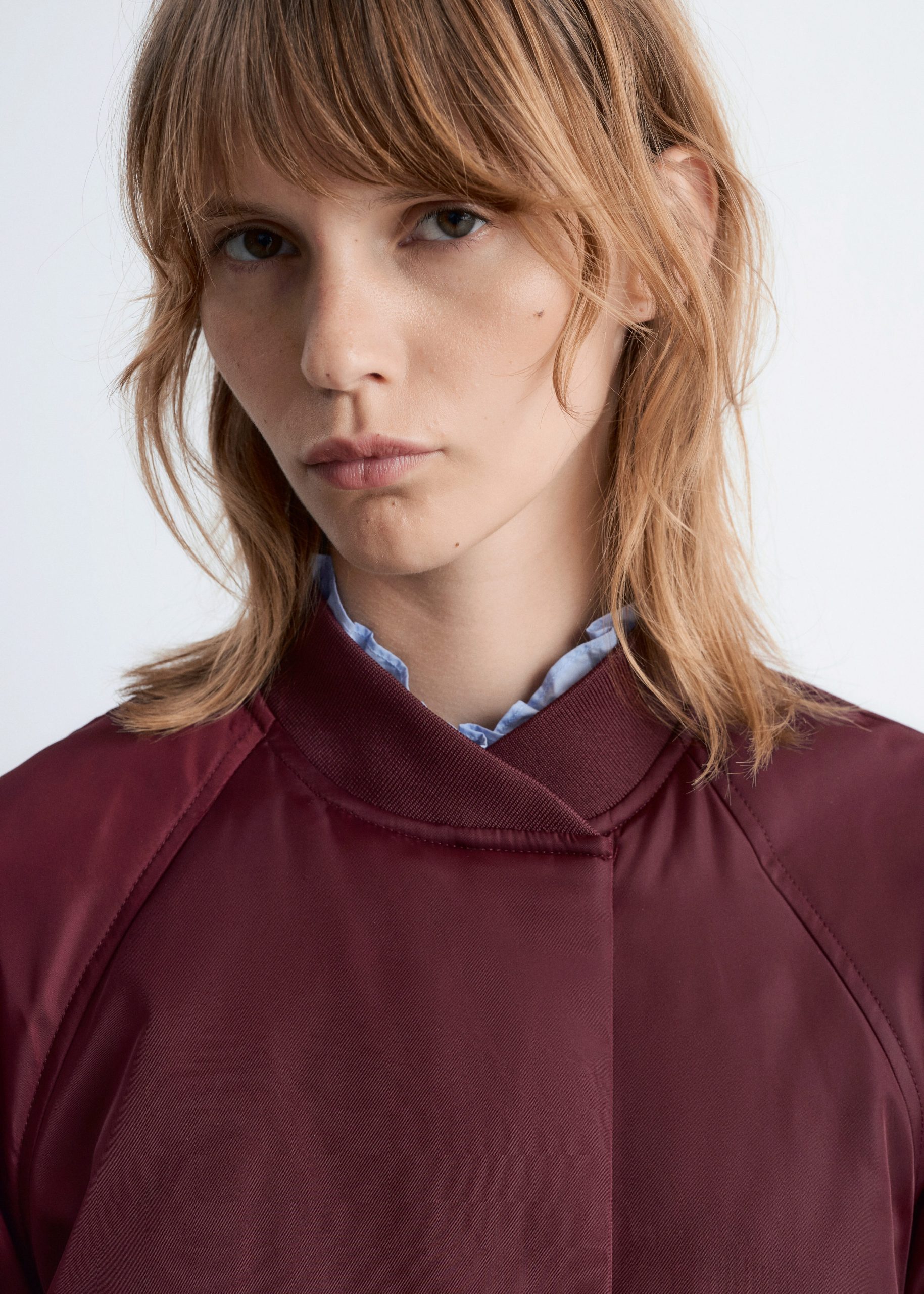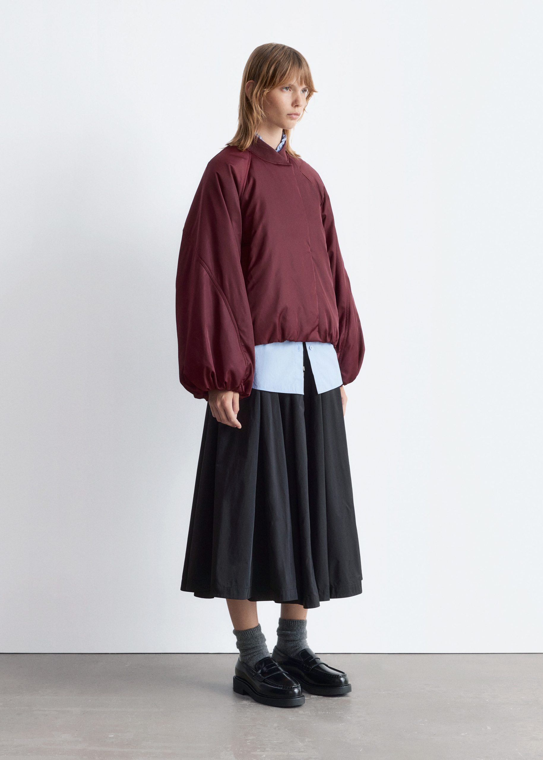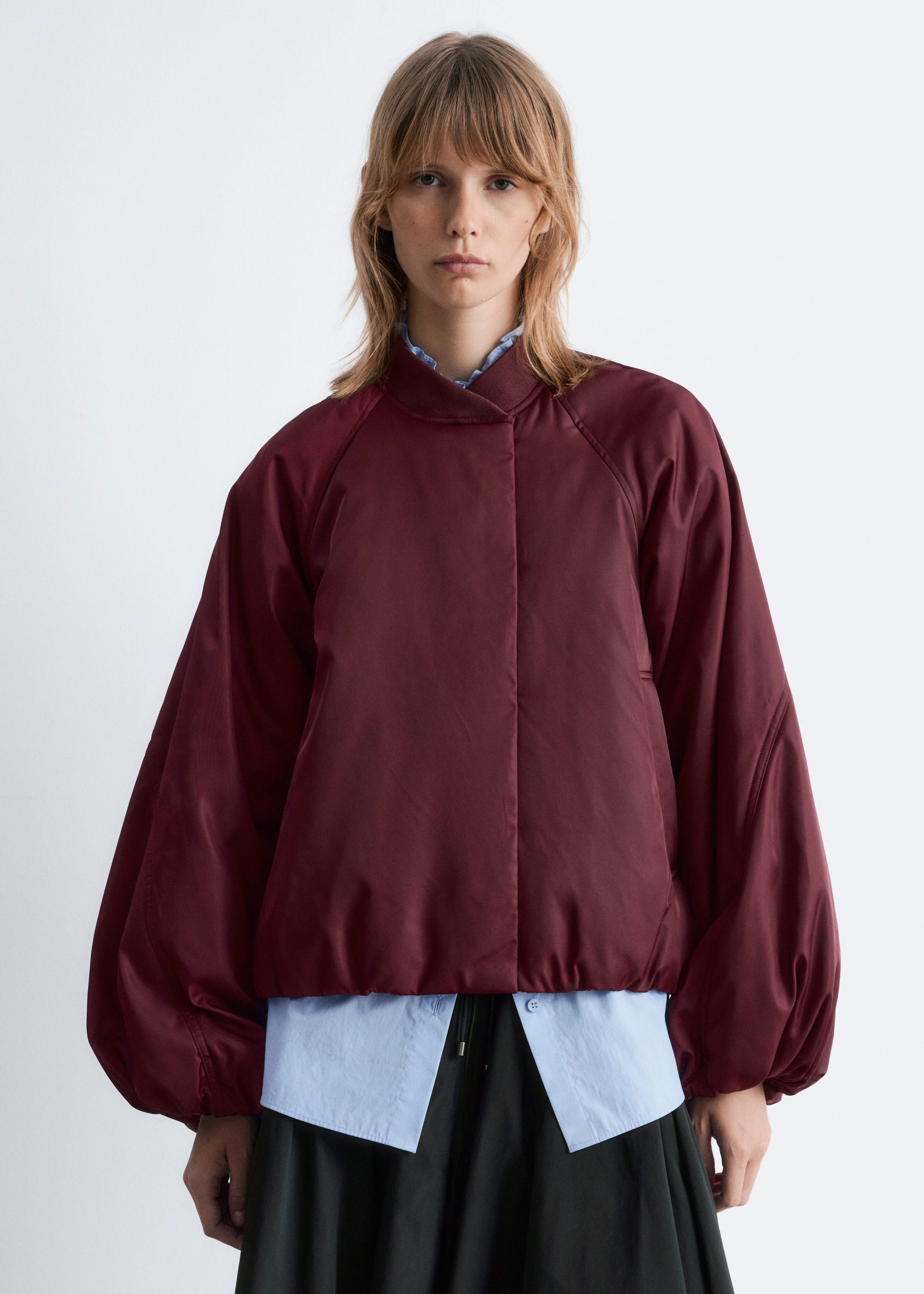 Padded bomber jacket with a technical finish. Designed with billowy sleeves and duo welt pockets.
