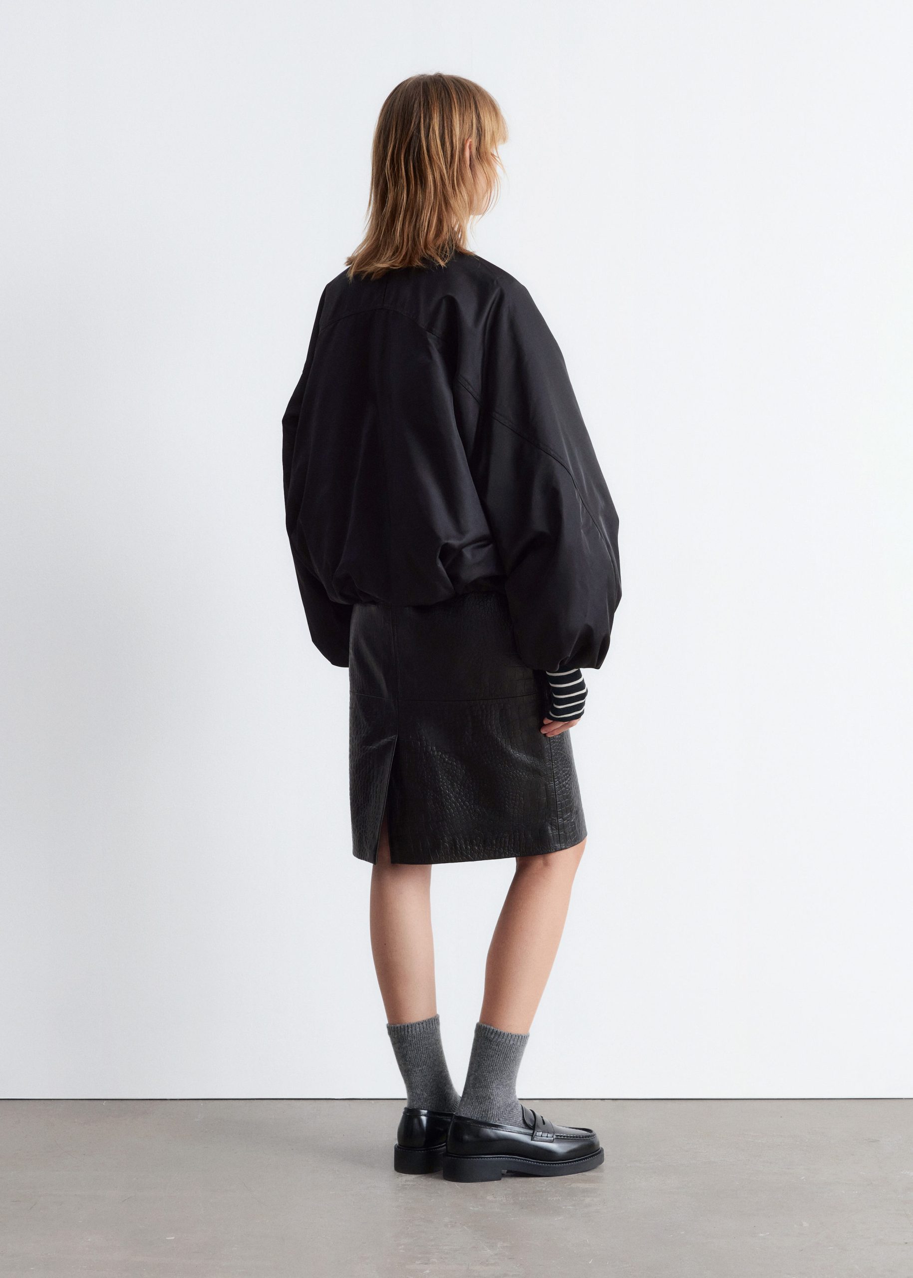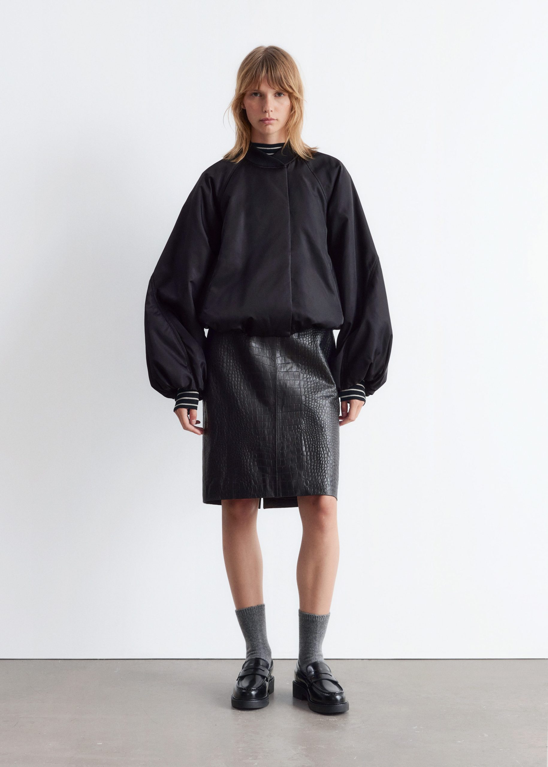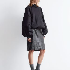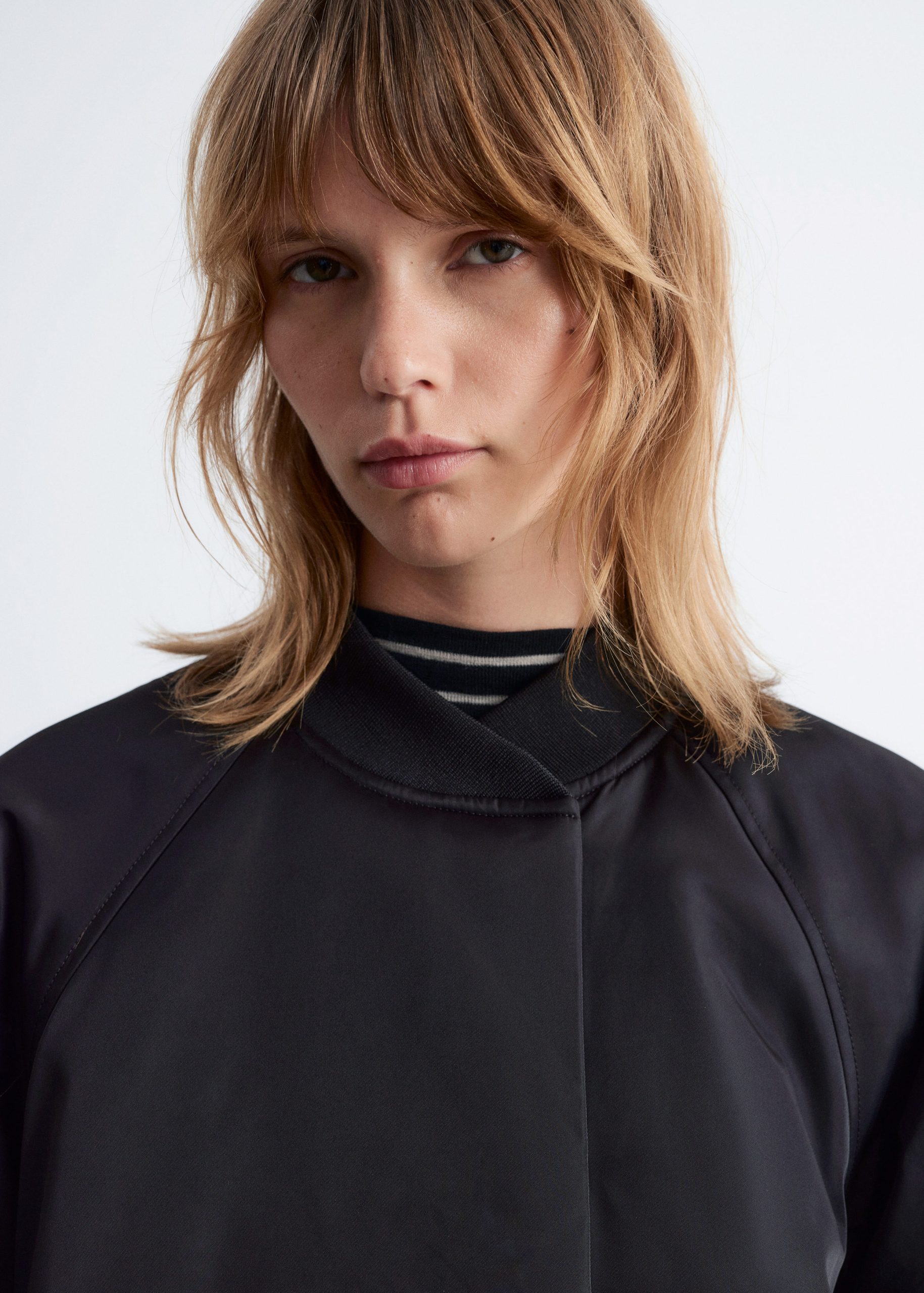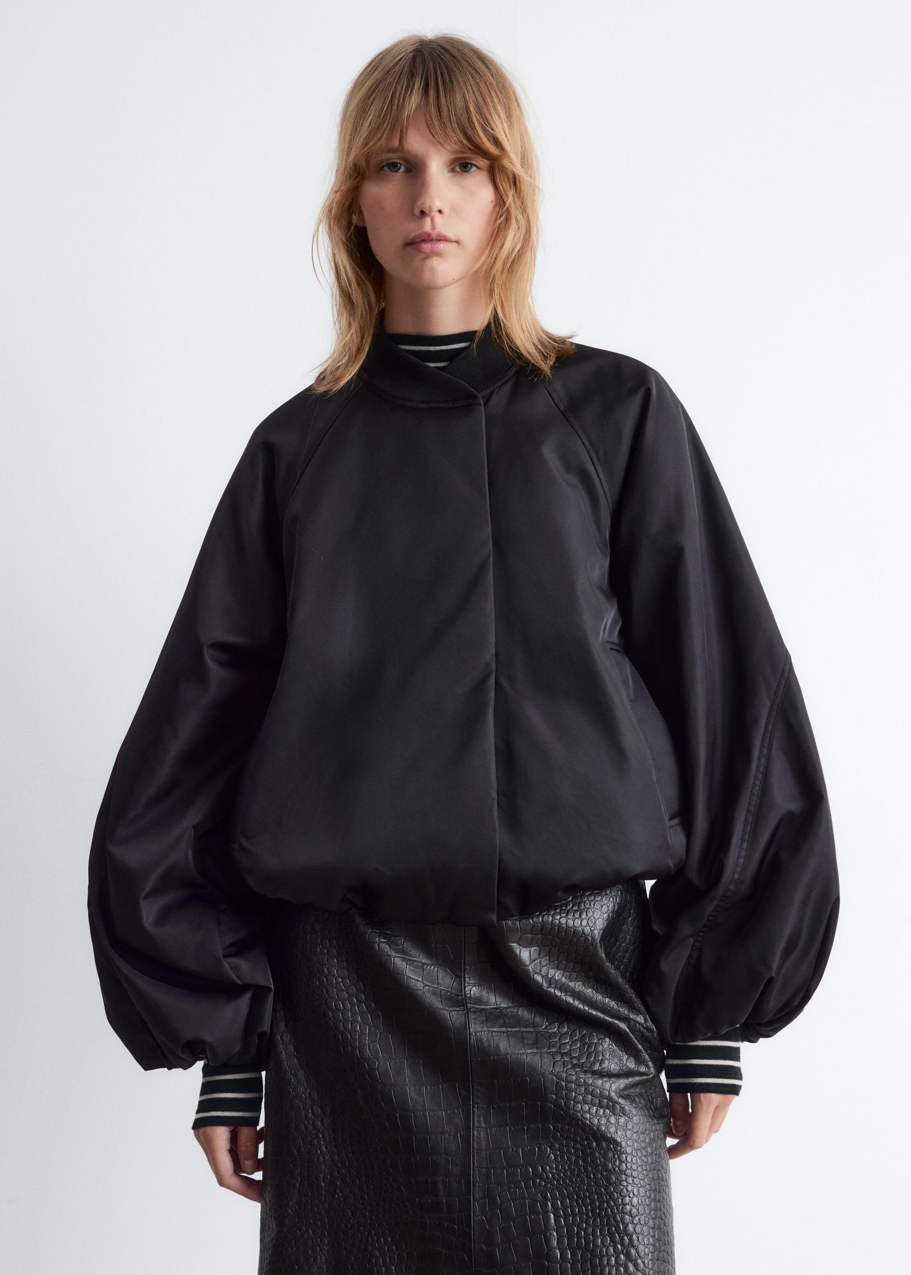 Padded bomber jacket with a technical finish. Designed with billowy sleeves and duo welt pockets.
