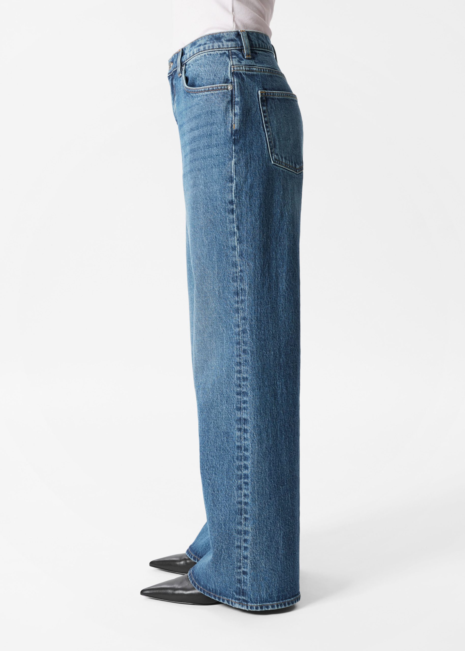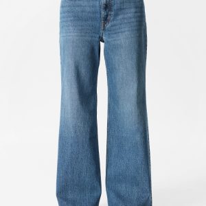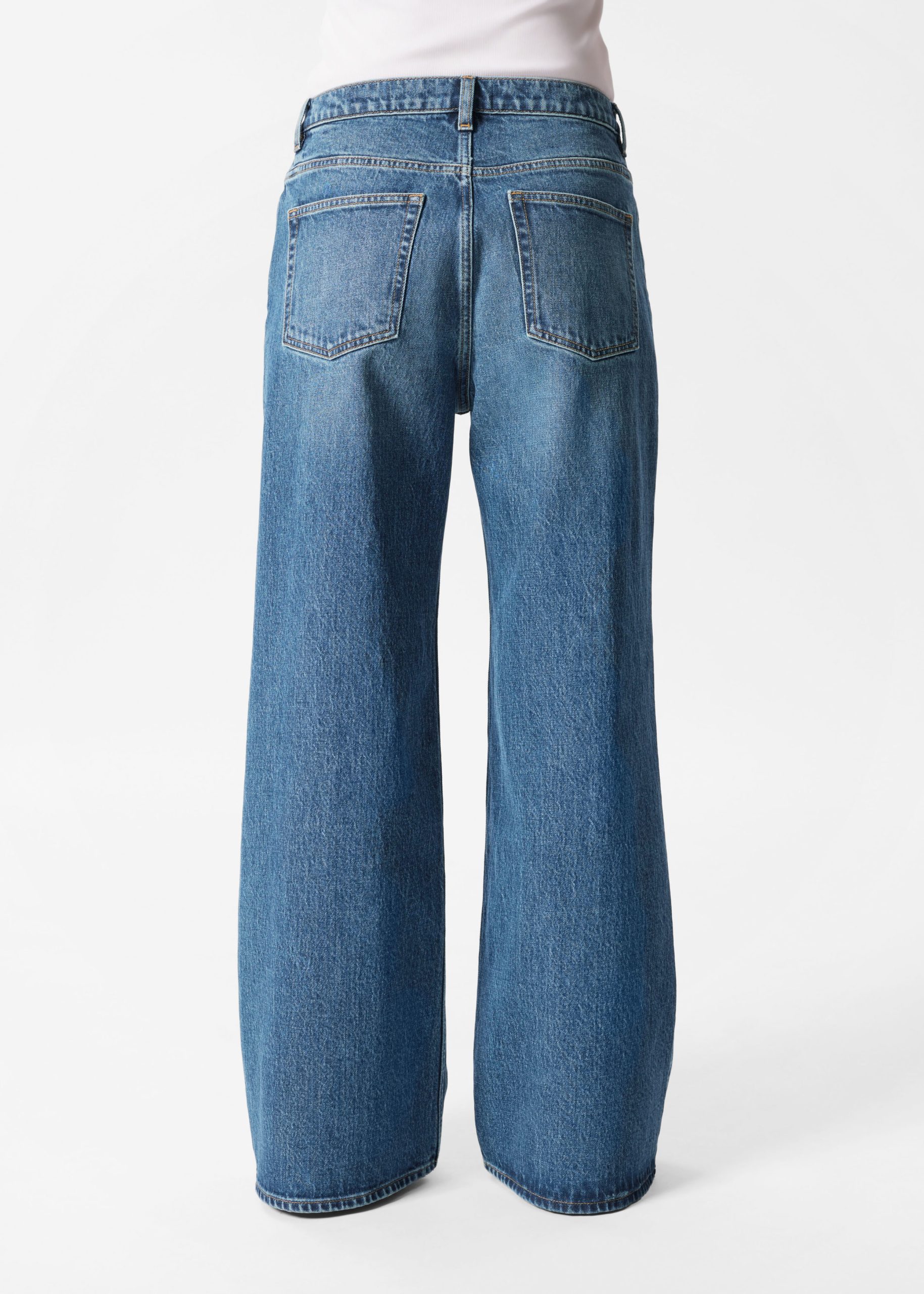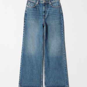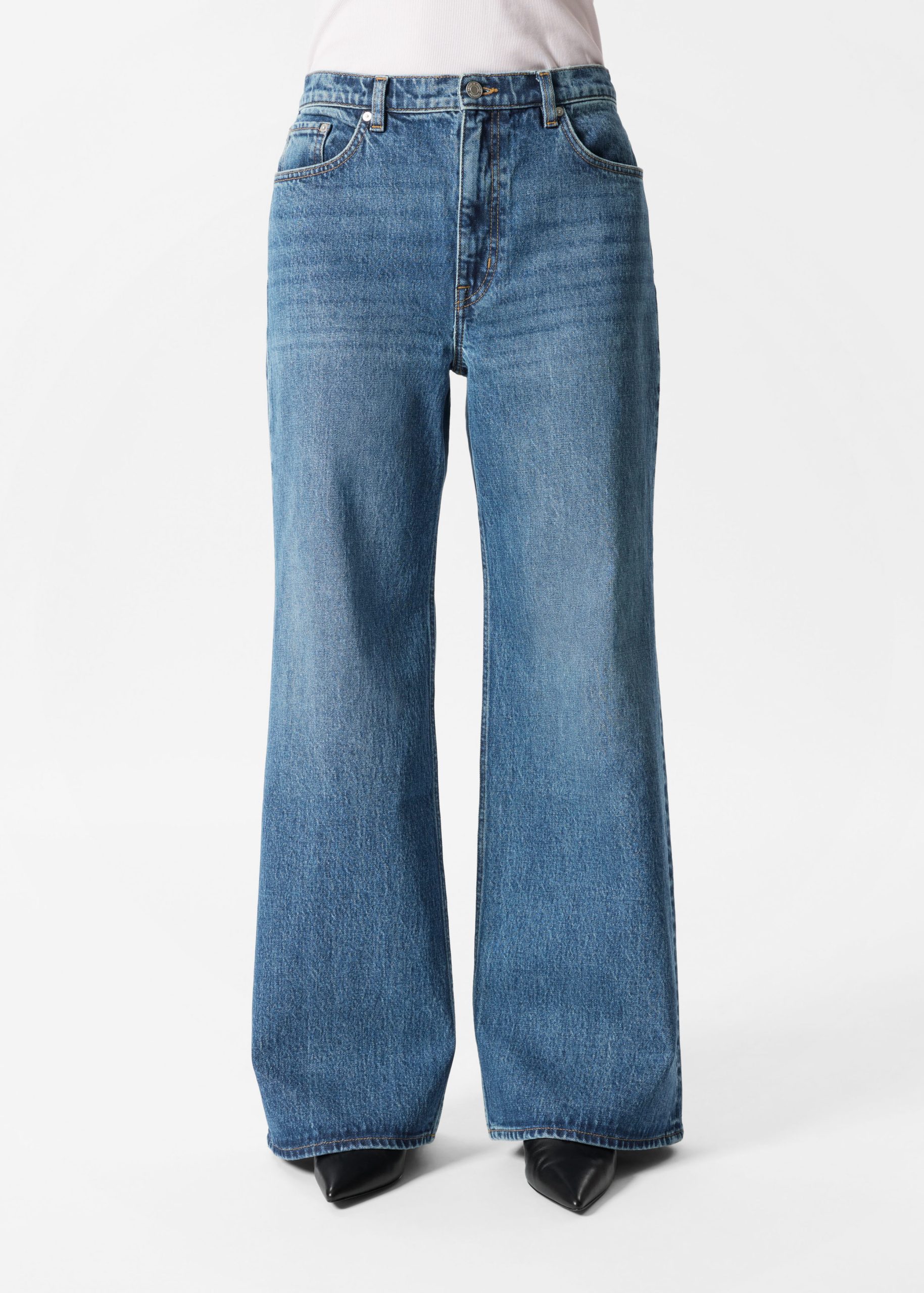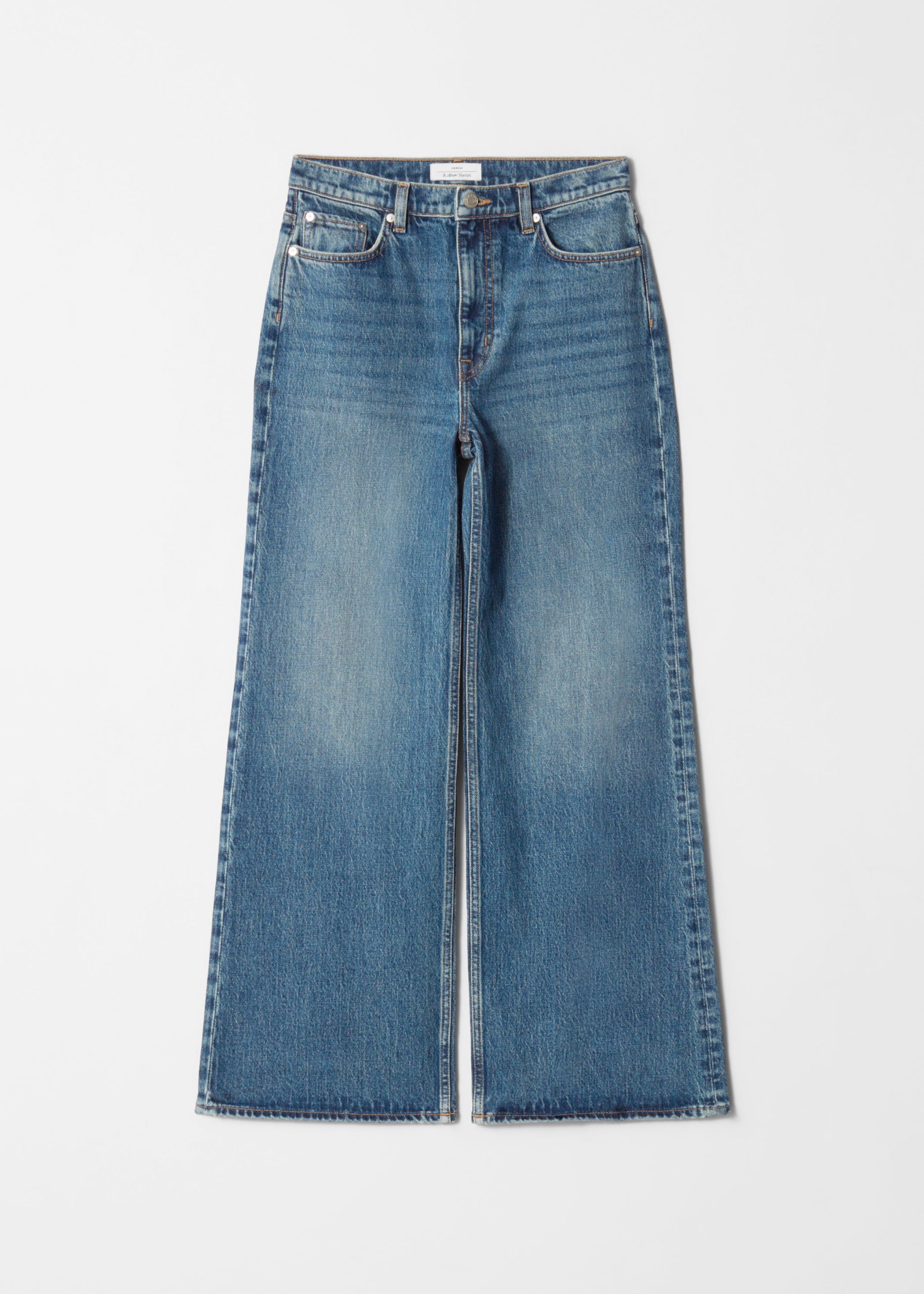 High waisted jeans featuring long, wide legs and a classic 5-pocket denim finish.