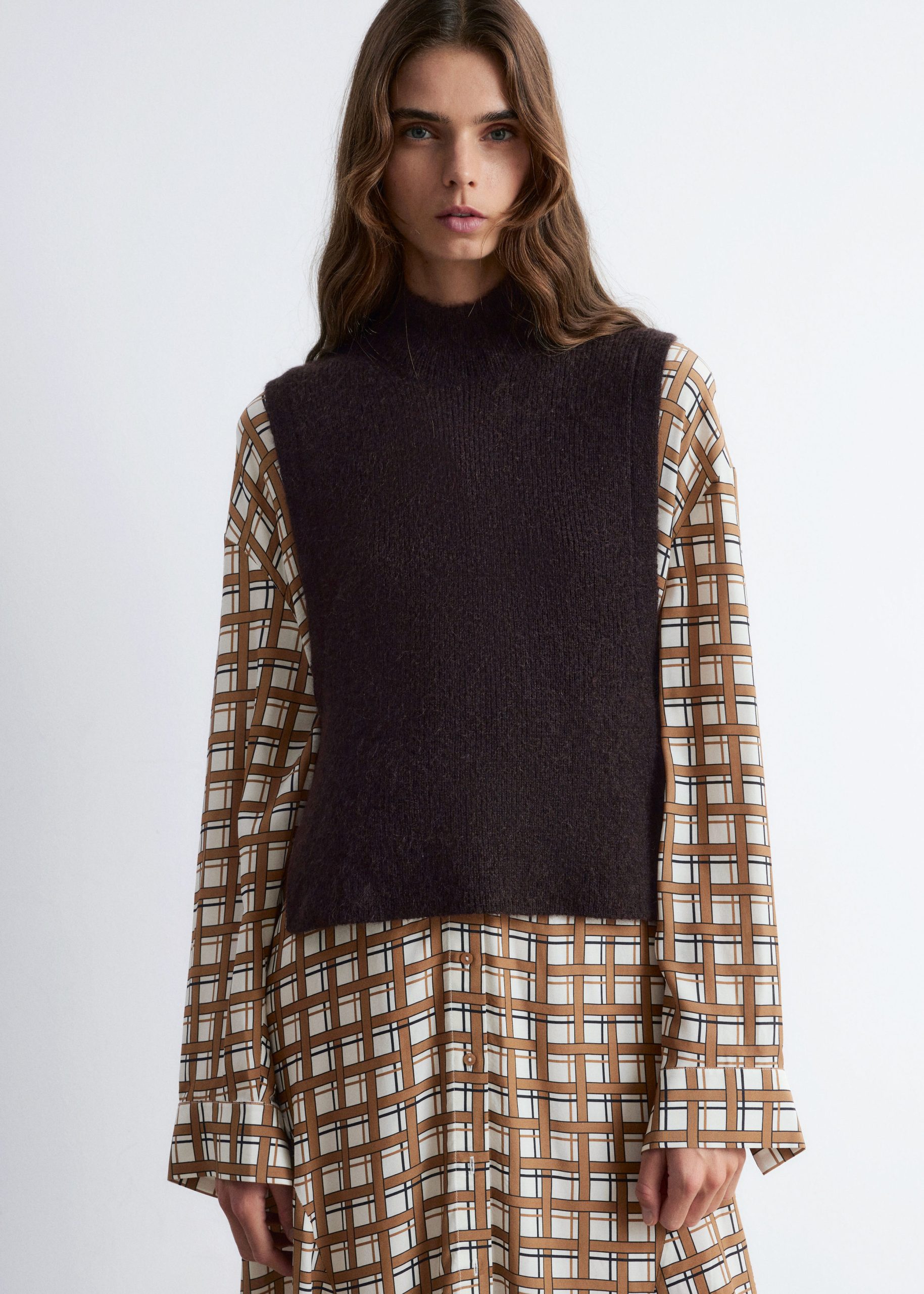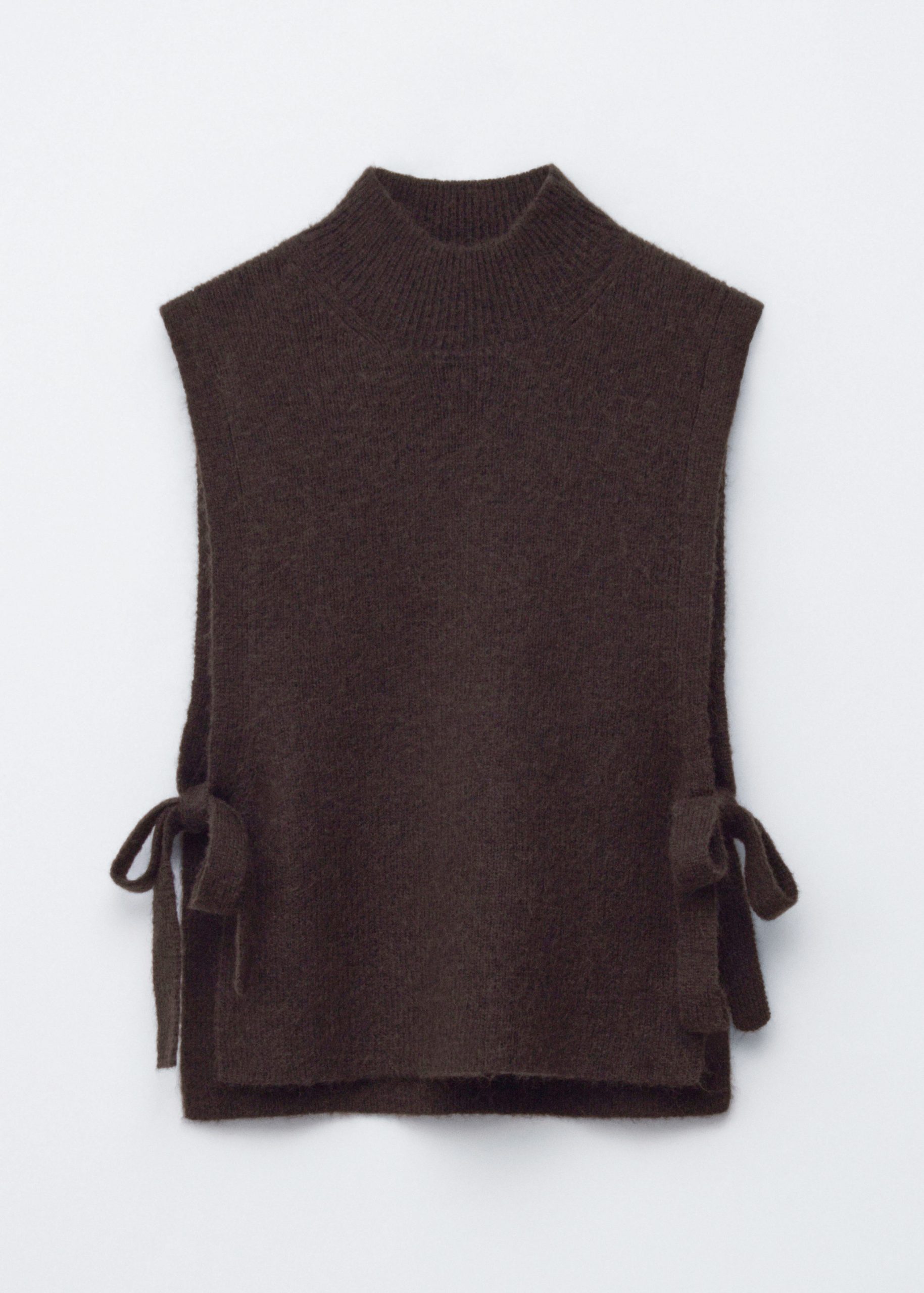 Mock neck bib collar knitted from soft wool and mohair. Detailed with ties at the sides.