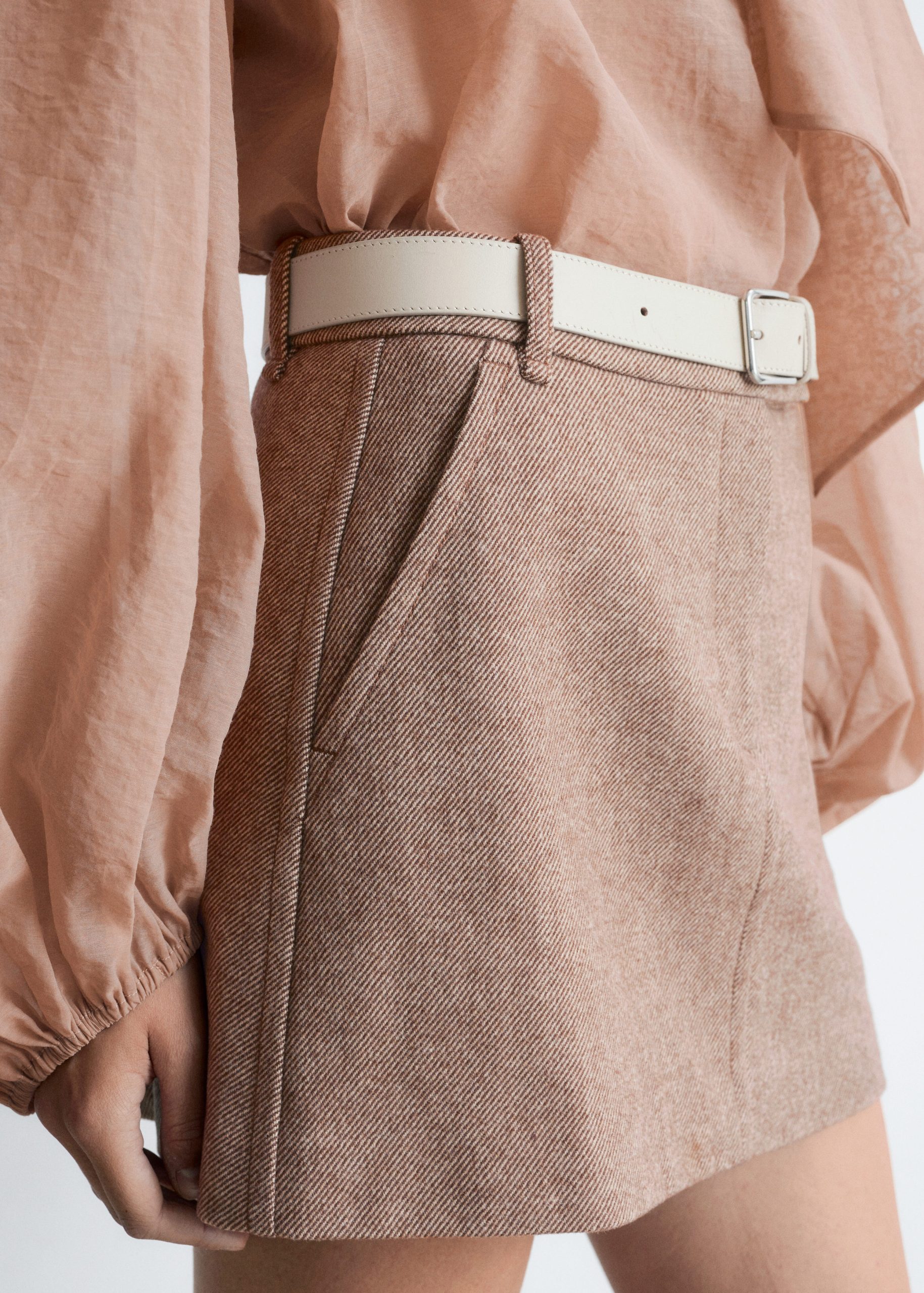 This mini skirt is crafted from a twill wool-blend. Cut in a clean, A-line silhouette, it features a regular waist, slanted side seam pockets, and a zip fly with a hook-and-bar closure.